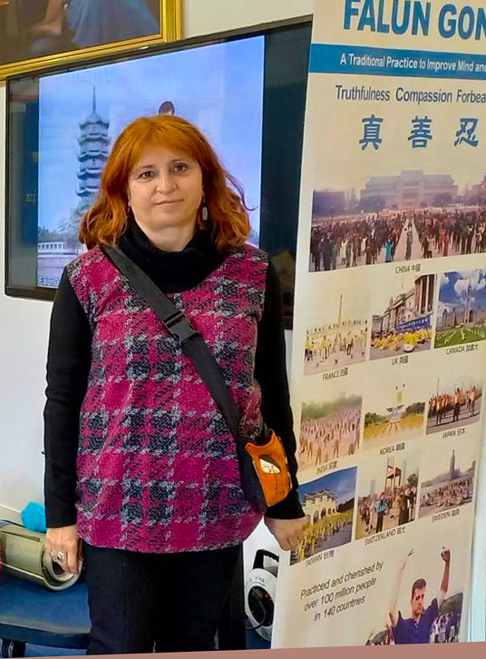 五十岁的埃斯特(Esther)女士是第一次接触法轮大法,她被法轮大法传达的宁静与平和深深吸引。她参加了法轮功介绍会,并学习了五套功法。她分享了在学炼功法时的专注感、能量流动与舒适感。她感到在学炼法轮大法时就像把日常生活的喧嚣按了暂停键,她感到内心深层的真正的自我在觉醒。
