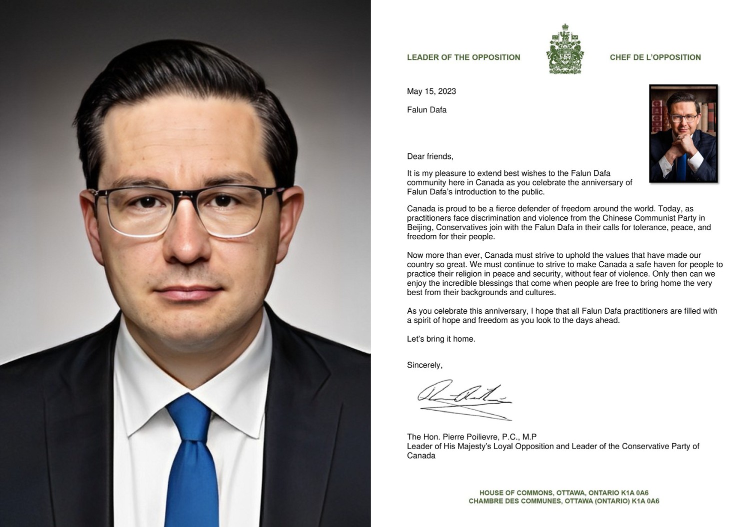 ![]() 图1:保守党领袖皮埃尔·鲍利夫(Pierre Poilievre)发贺信,他说:“在加拿大庆祝法轮大法弘传周年纪念日之际,我很高兴向法轮大法致以最美好的祝愿。” |