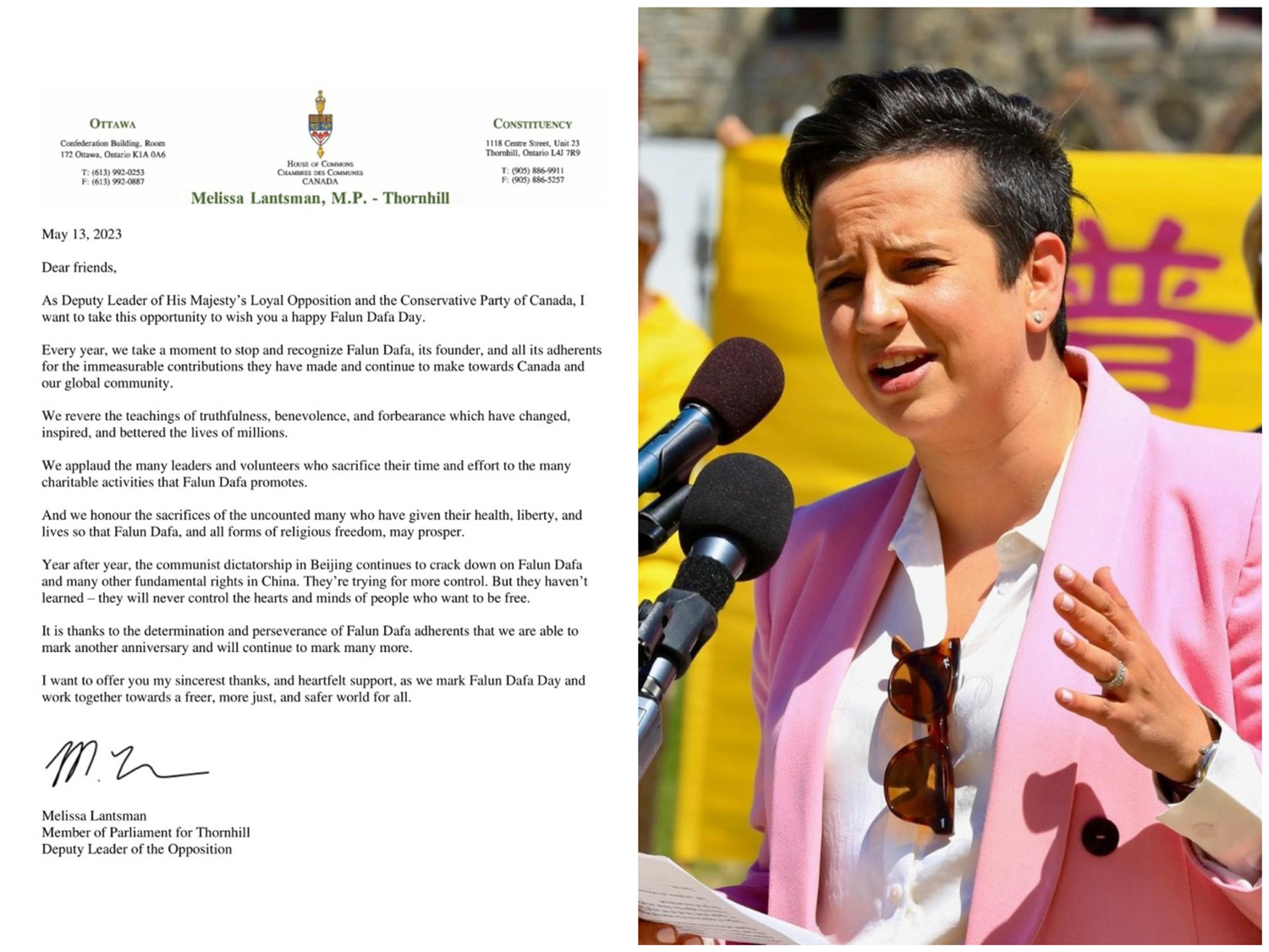 ![]() 图2:加拿大保守党副领袖梅莉萨·兰兹曼(Melissa Lantsman)发贺信,祝大家法轮大法日快乐! |