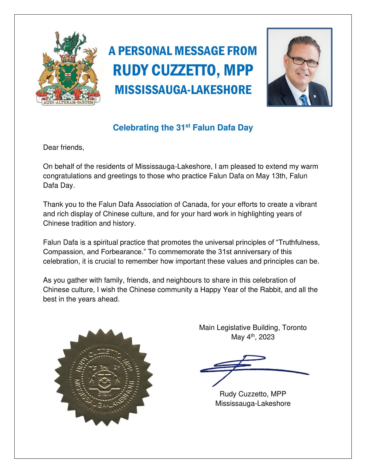 ![]() 图3:密西沙加湖岸省议员鲁迪·库泽托(Rudy Cuzzetto)的贺信 |