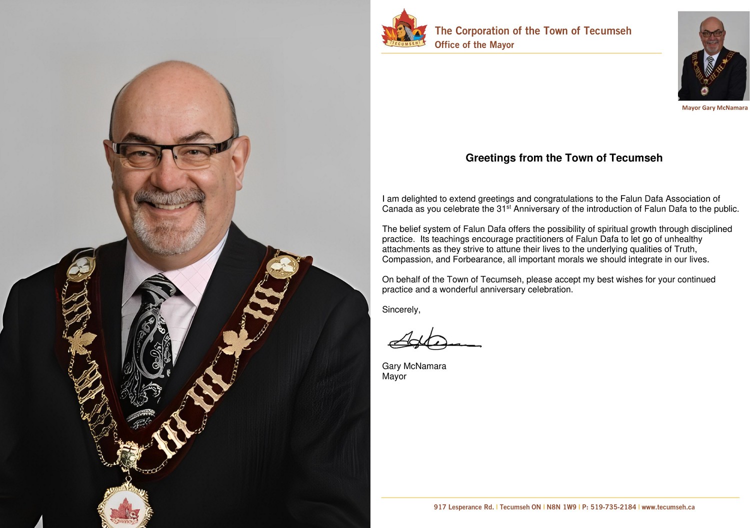 特库姆塞镇镇长加里·麦克纳马拉(Gary McNamara)在贺信中说:在你们庆祝法轮大法弘传三十一周年之际,我很高兴向加拿大法轮大法学会致以问候和祝贺。