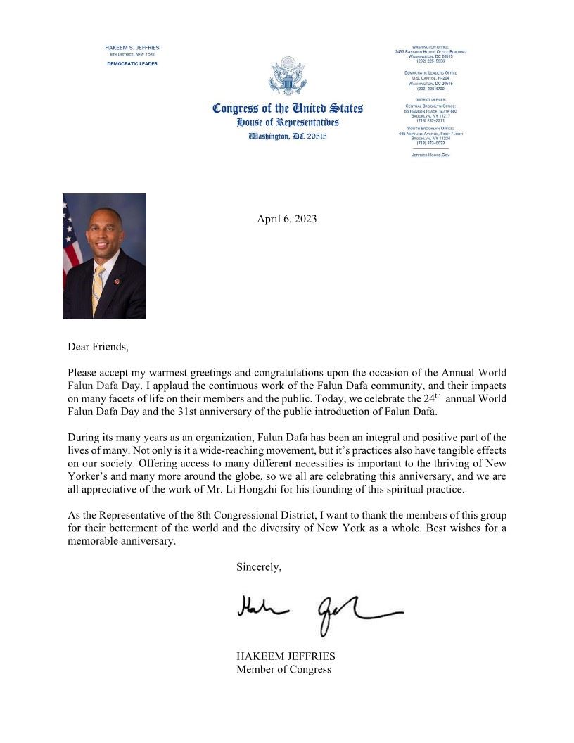 ![]() 图2:众议院少数党领袖和民主党党团领袖、纽约州第八选区联邦众议员哈基姆·杰弗里斯(Hakeem Jeffries)表示:“我们都在庆祝这个纪念日,并且非常感谢李洪志先生创立这种修炼方法。” |