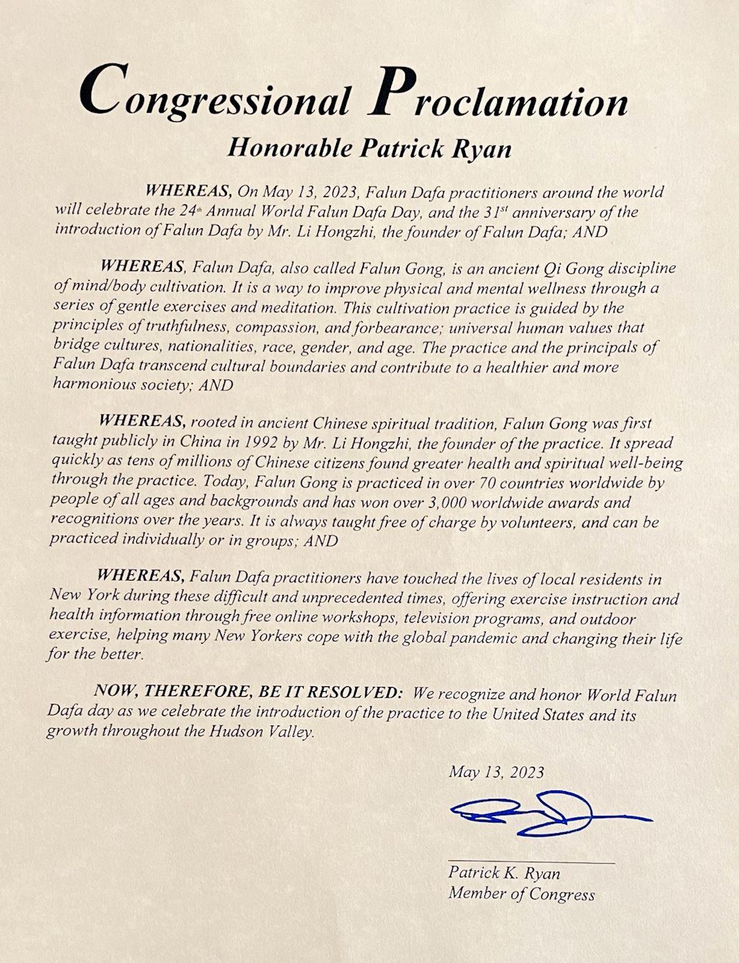 纽约州第十八选区联邦众议员帕特里克·瑞安(Patrick Ryan)在褒奖令中写道:“(法轮大法)这门修炼以‘真、善、忍’原则为指导,这些普世的人类价值在不同文化、国籍、种族、性别和年龄之间架起桥梁。这一功法和法轮大法的这些原则超越文化界限,有助于创建一种更健康、更和睦的社会。”