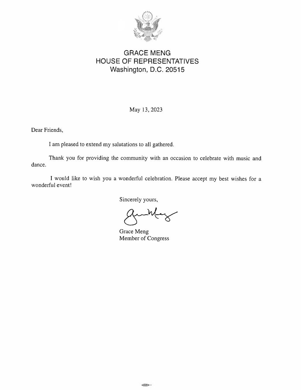 新近加入拜登总统竞选连任“全国顾问委员会”的纽约州第六选区联邦众议员孟昭文(Grace Meng)发来贺信: