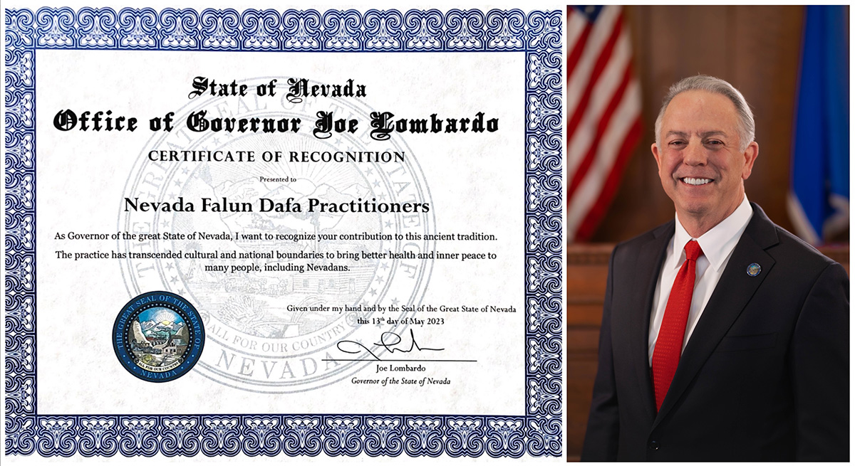 内华达州州长乔·隆巴多在给李洪志先生的褒奖状中说:“作为大内华达州州长,我想表彰您对这一古老传统的贡献。您的贡献超越了文化和国界,为内华达人在内的许多人,带来了更好的健康和内心的平静。”