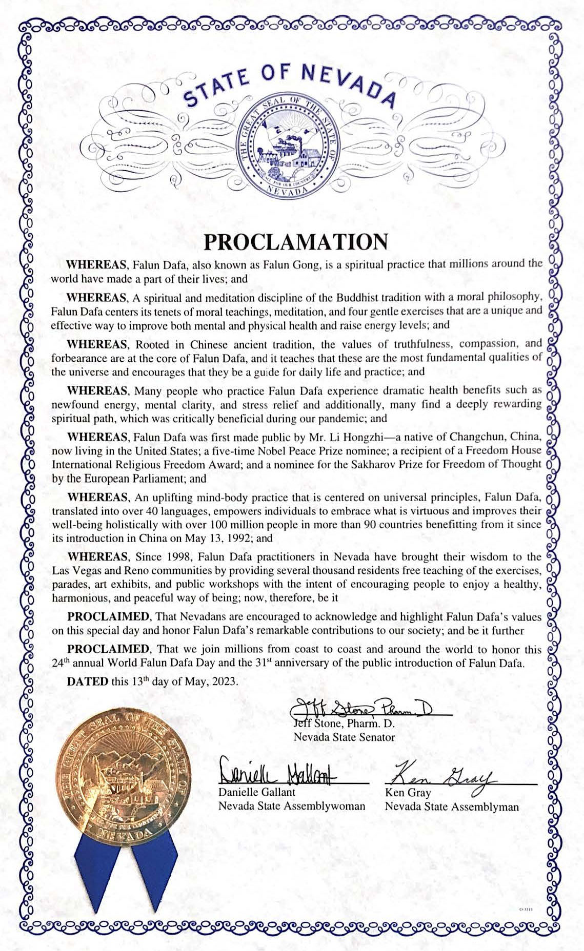 我们宣布,鼓励内华达人在这个特殊的日子认同、强调法轮大法的价值,并表彰法轮大法对我们社会的卓越贡献;并进一步宣布,