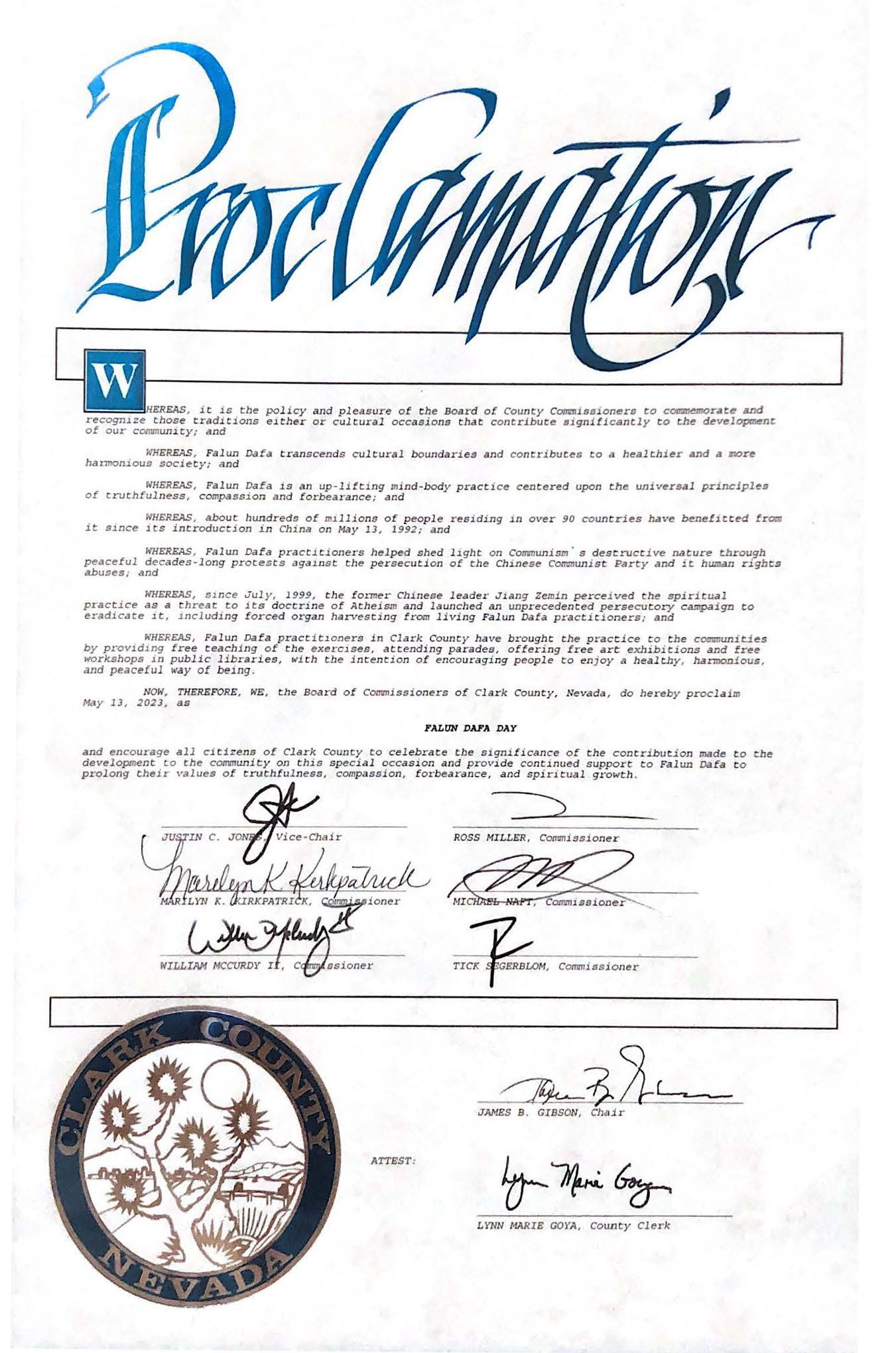 同时,内华达州参众两院颁发褒奖令,表彰法轮大法;内华达克拉克县政府宣布:五月十三日为克拉克县的法轮大法日。