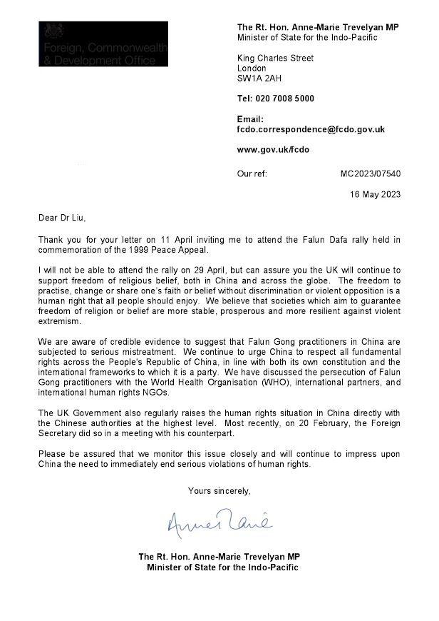 英国印度太平洋事务国务部长安妮-玛丽•特雷维利安议员(The Rt. Hon. Anne-Marie Trevelyan MP)的来信全文如下: