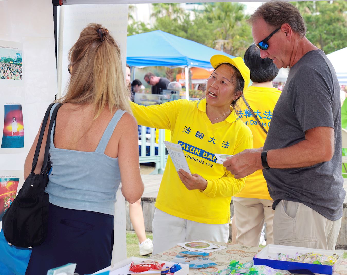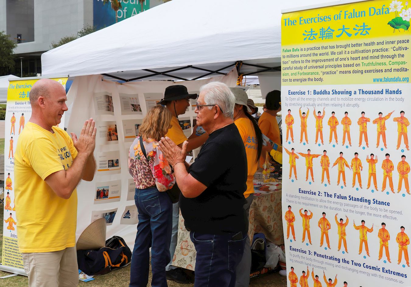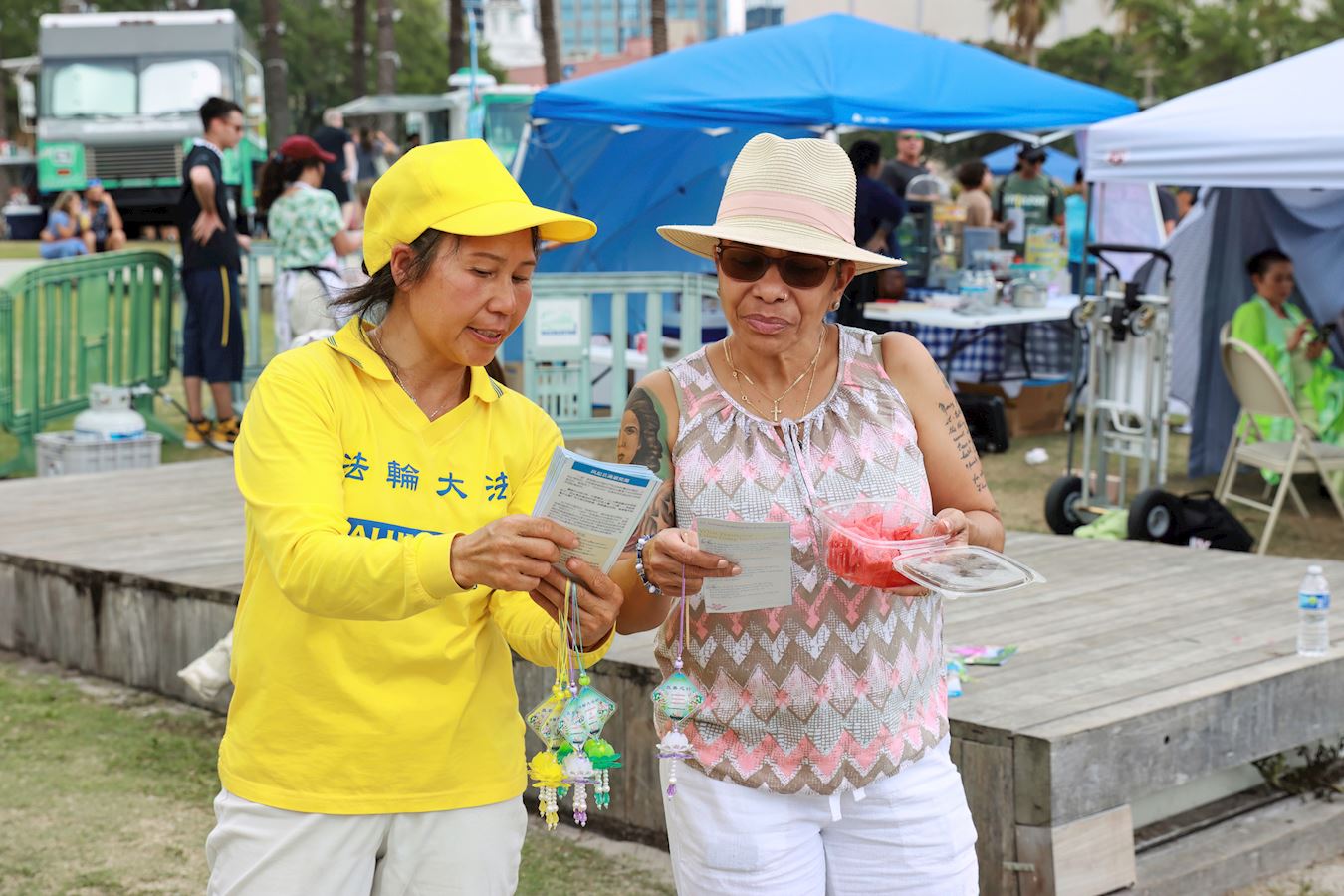在一天的庆典活动中,佛州学员通过举办法轮大法图片展,集体炼功,舞台展示,演讲等各种活动,向代表亚洲不同国家的人们和参加节日活动的游人介绍法轮功。
