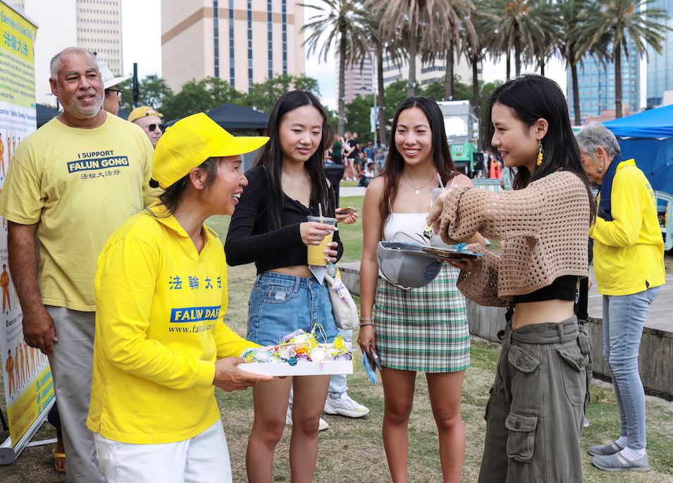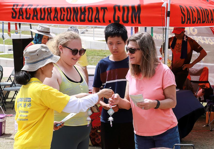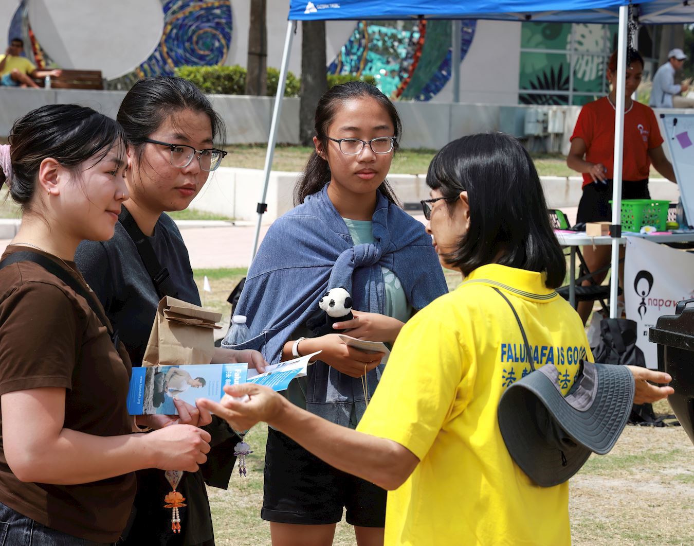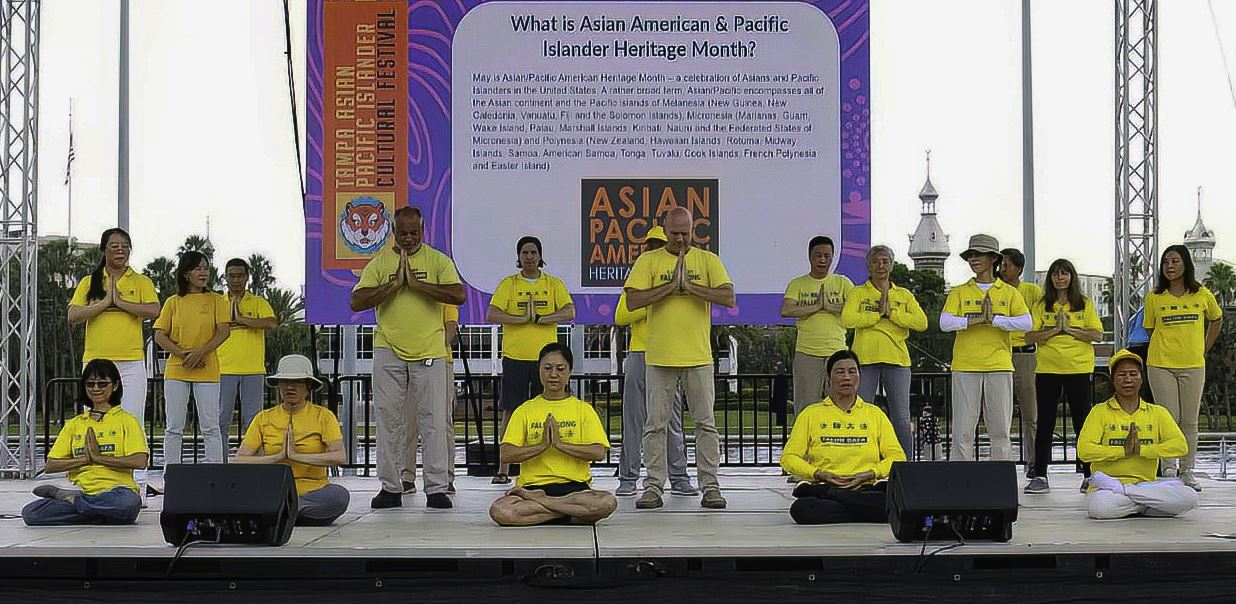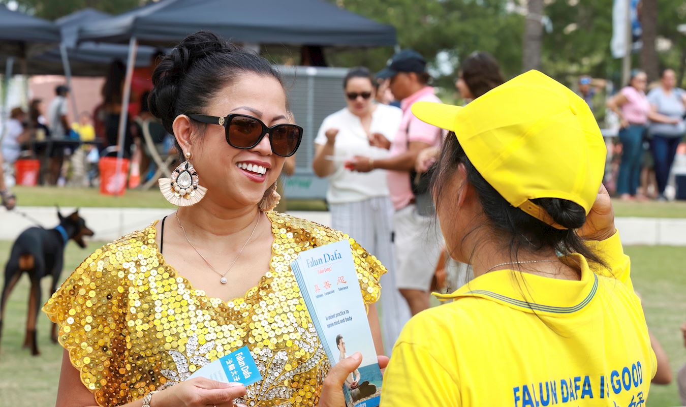 在一天的庆典活动中,佛州学员通过举办法轮大法图片展,集体炼功,舞台展示,演讲等各种活动,向代表亚洲不同国家的人们和参加节日活动的游人介绍法轮功。