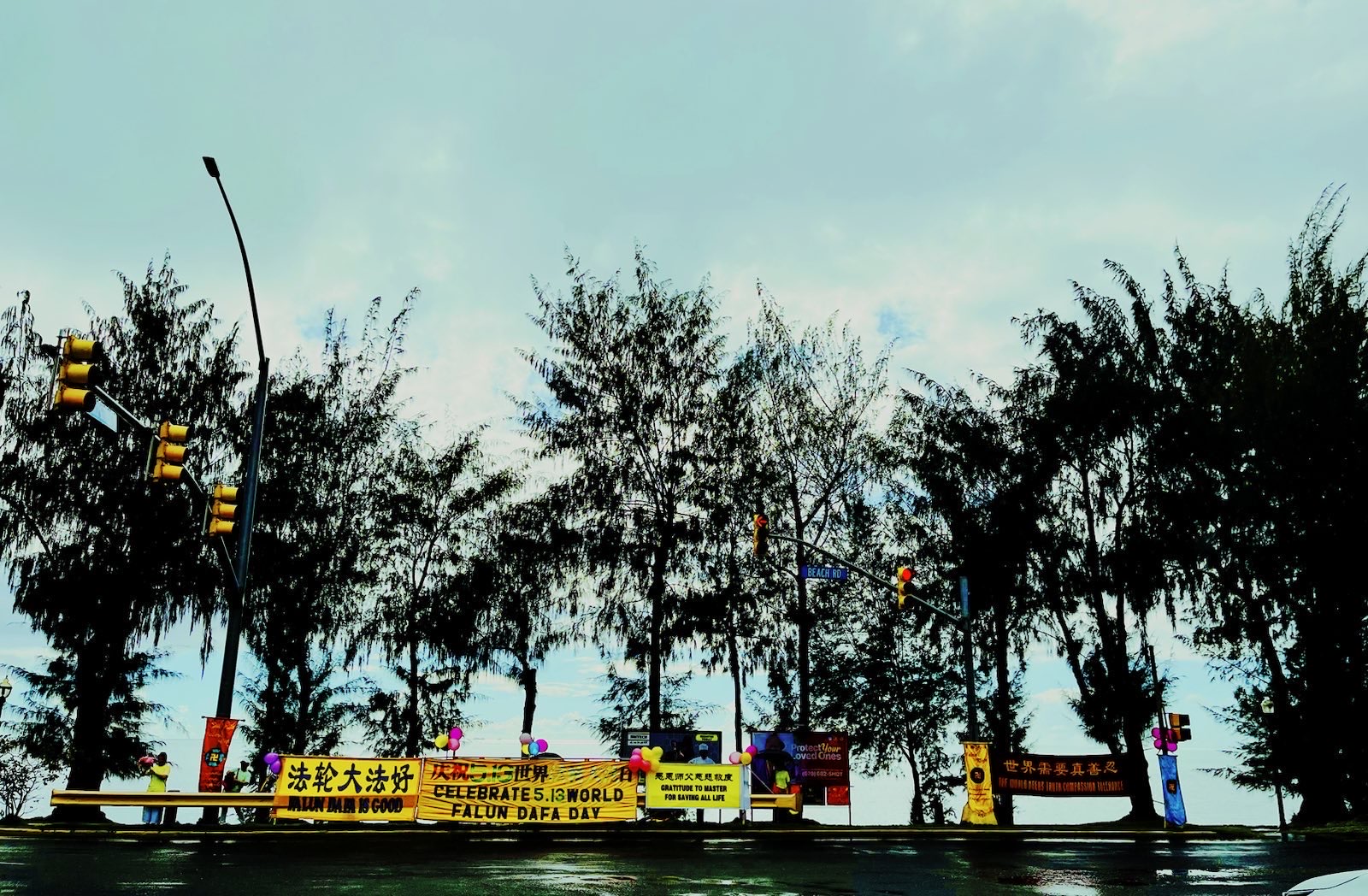 五月十三日下午三点左右至晚上六点多,当地法轮大法弟子在TOYOTA车行附近的三岔路口的安全地带拉横幅展示法轮大法的美好,传播法轮大法的福音、发放真相资料、赠送小莲花作为小礼物给当地市民,市民愉快地将赠送的小莲花作为车挂,互动中人们心态祥和友善,市民表达对世界法轮大法日的庆祝,来往车辆在红灯前停止下来时与大法弟子挥手打招呼,鸣笛示意,回应“Falun Dafa is good (法轮大法好)”。