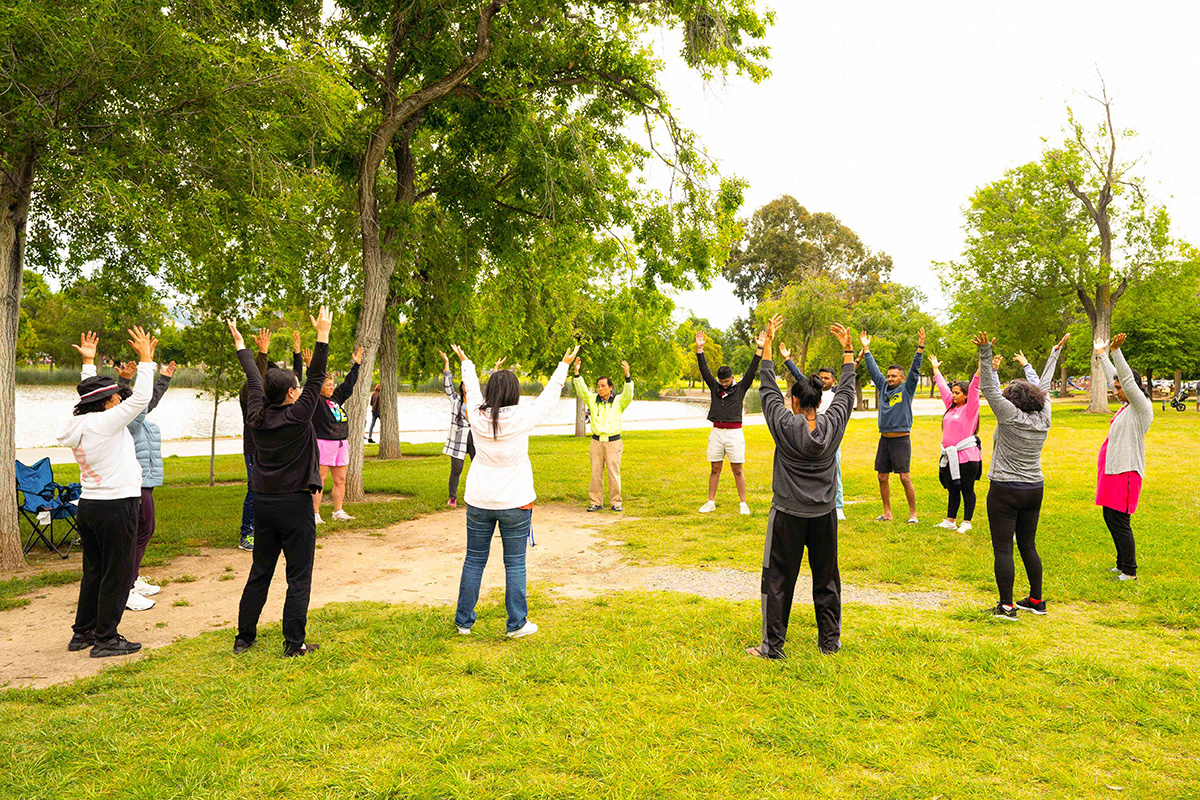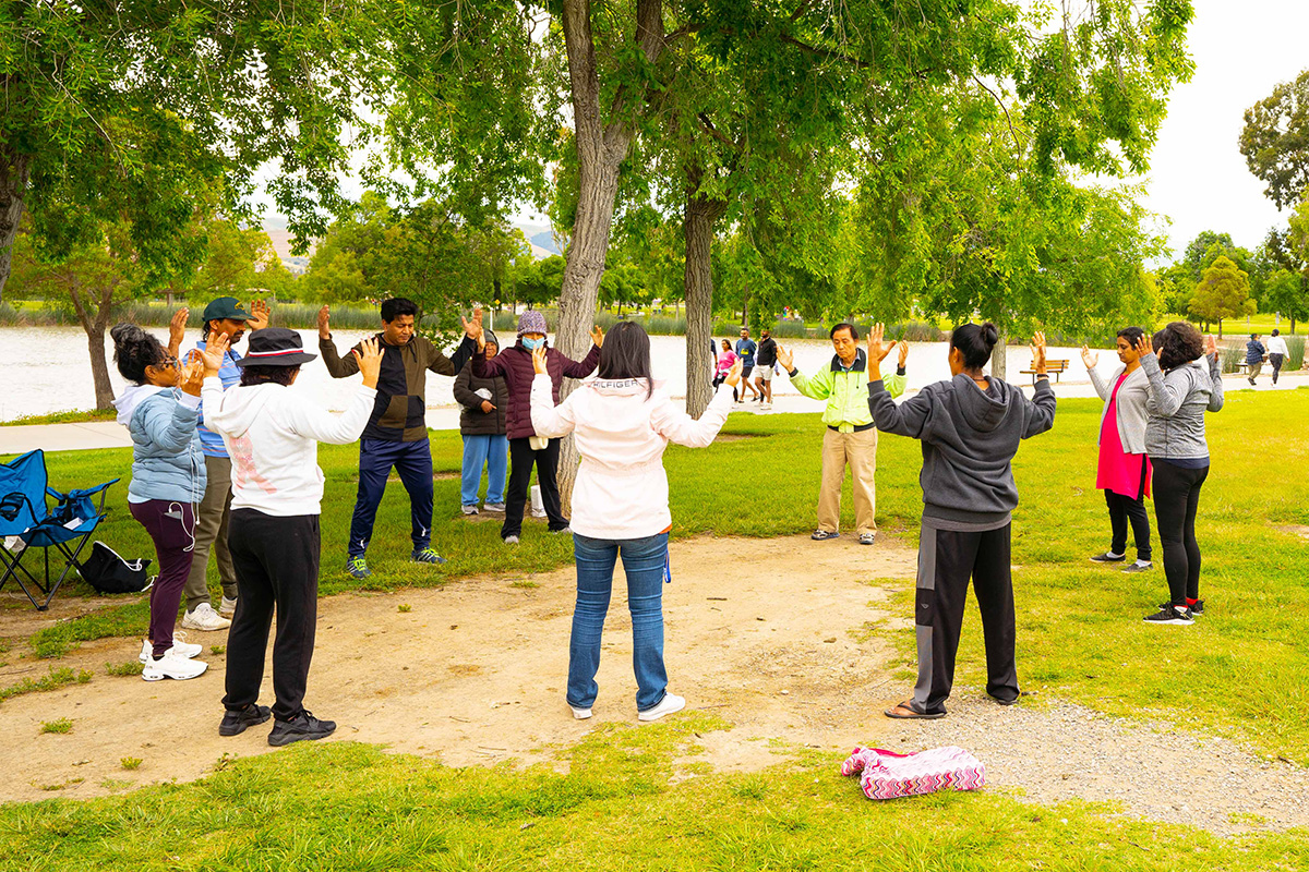 位于旧金山东湾的佛利蒙(Fremont),风景秀丽,许多市民喜欢沿着公园的伊丽莎白湖边散步。当天不少散步的民众看到法轮功免费教功班,就加入学功,体验一下法轮功功法。
