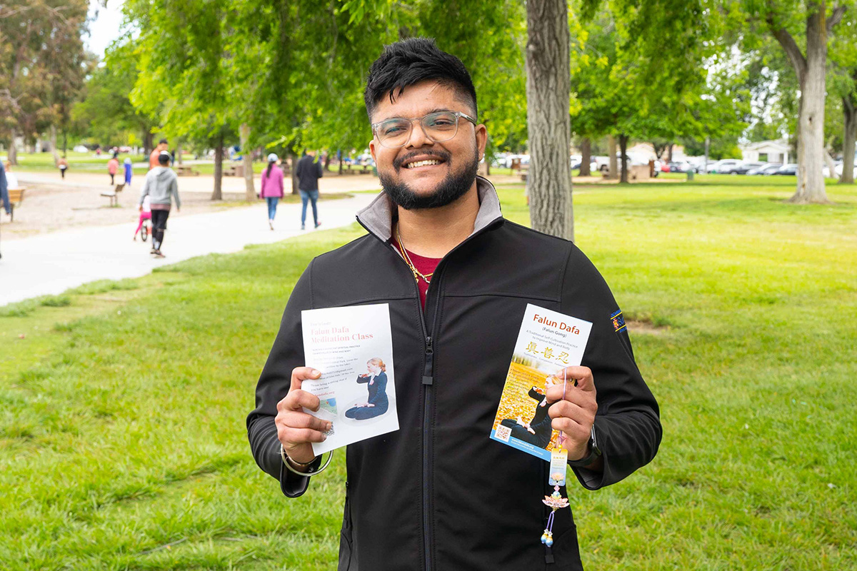 住在佛利蒙市的德瓦尔希·贾尼(Devarshi Jani)和妹妹以及朋友们来公园散步,他们看到法轮功教功班,就过来尝试。“我感觉很好,我的身体放松了,我感到非常宁静、平和,这是个美好的经历,令人感到震撼。”