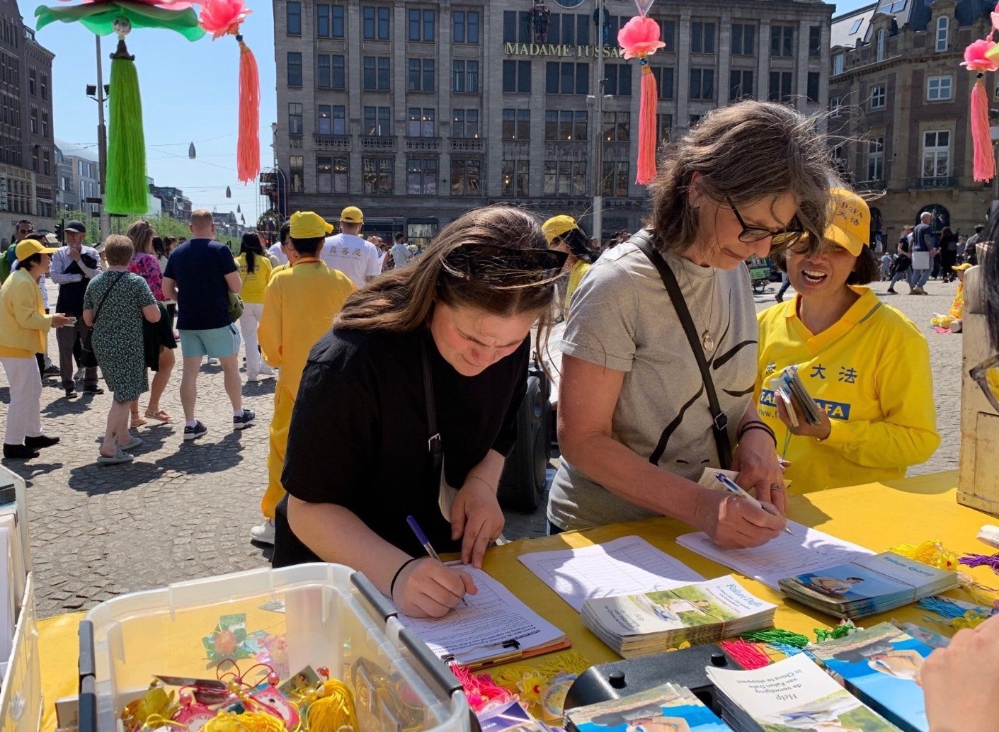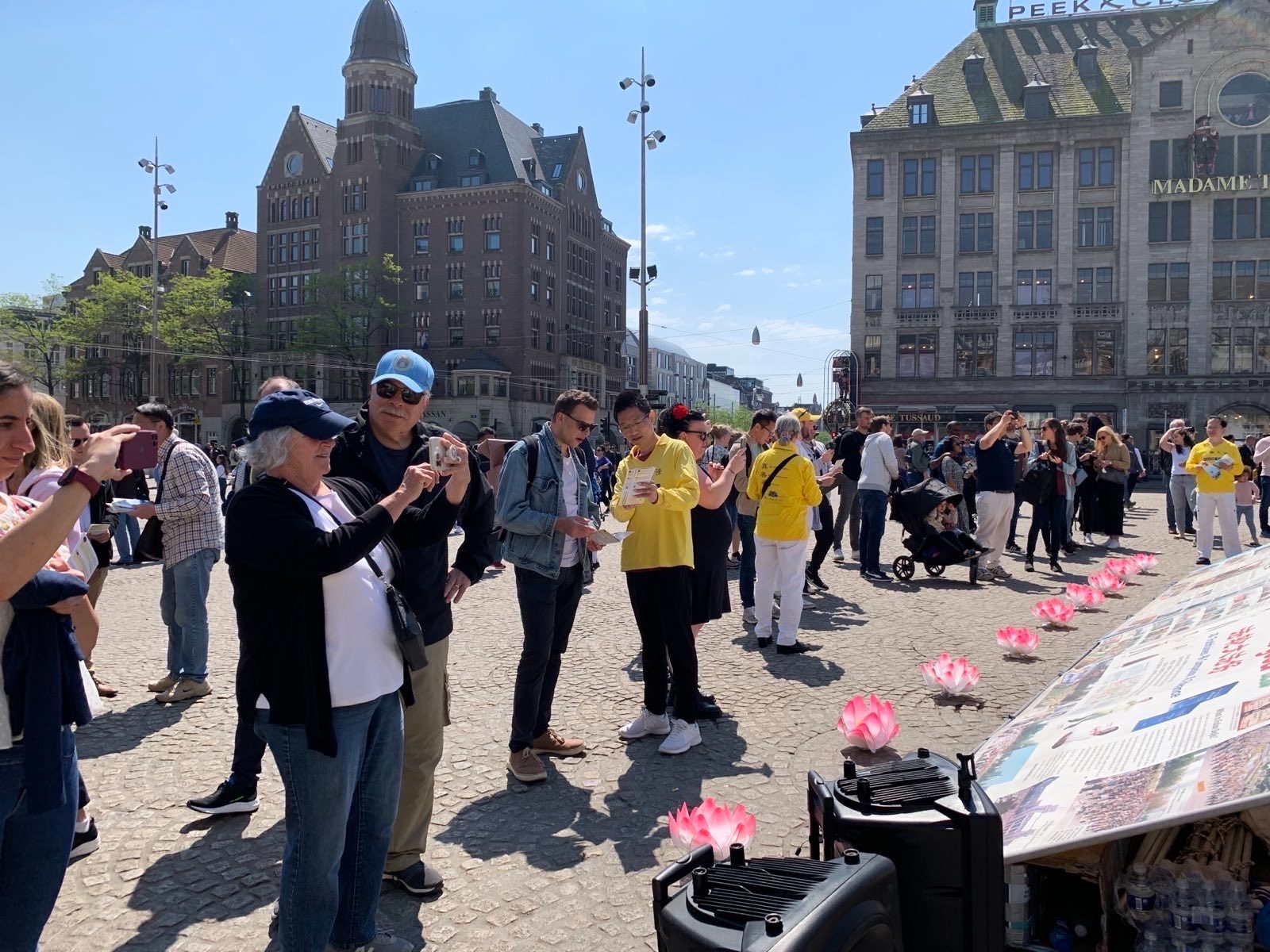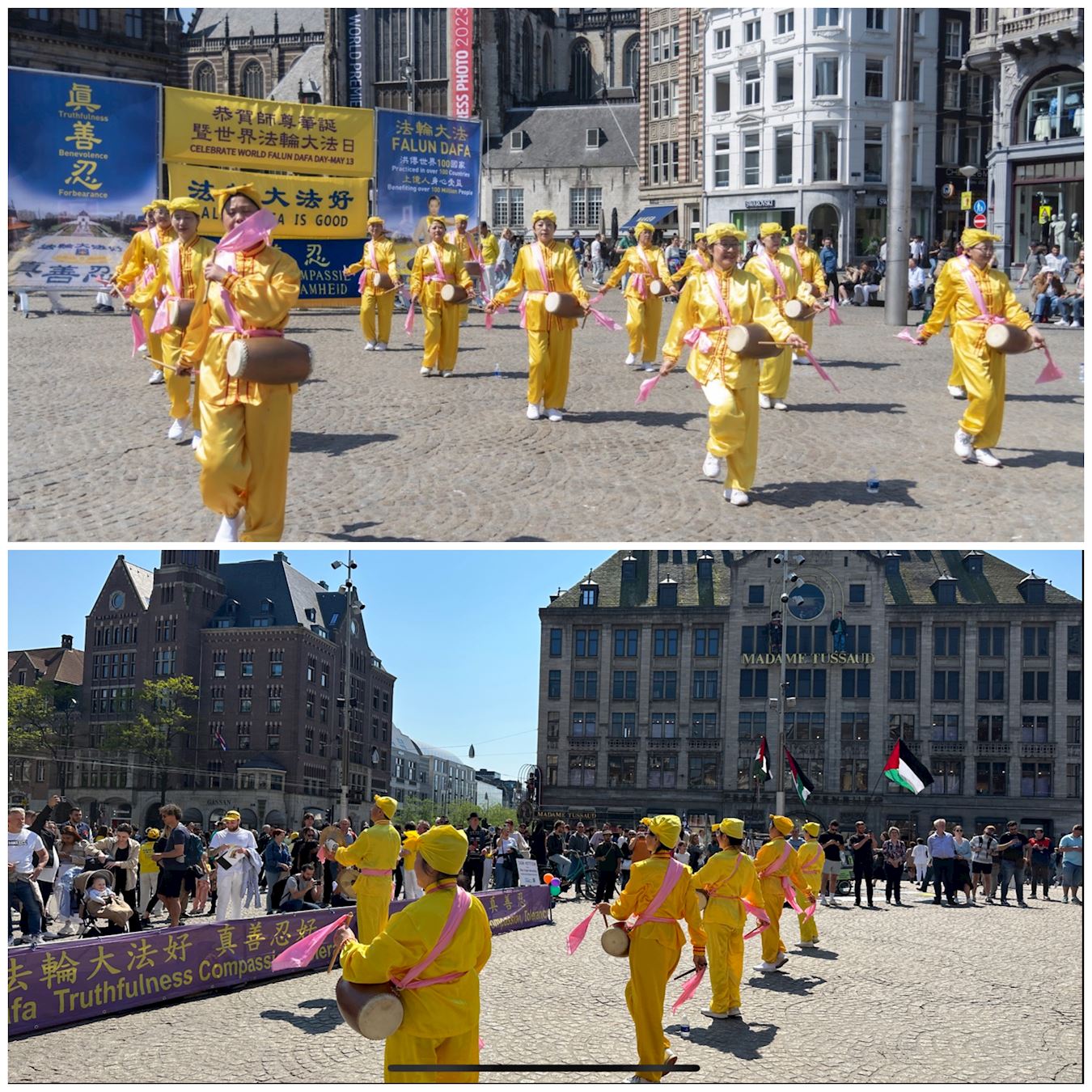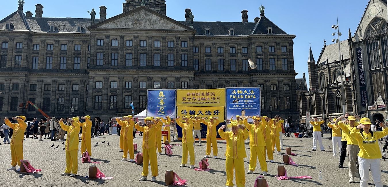 荷兰的春天,阳光明媚,照耀着水坝广场。法轮功举办活动的地点正处于广场中心,现场悬挂的巨大横幅:“真善忍”、“法轮大法好”、“恭贺师尊华诞暨世界法轮大法日”,在阳光下闪闪发光,庄严神圣。