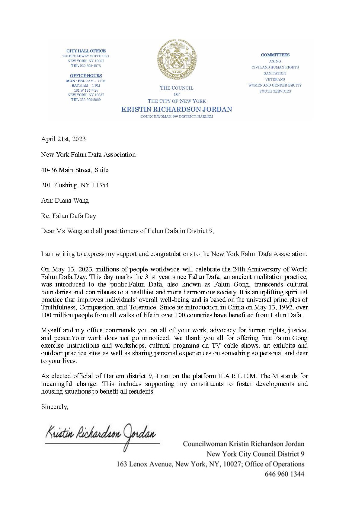 ![]() 图3:纽约市第九选区市议员克里斯汀·理查·森乔丹(Kristin Richardson Jordan)颁发贺信庆祝第二十四届世界法轮大法日。 |