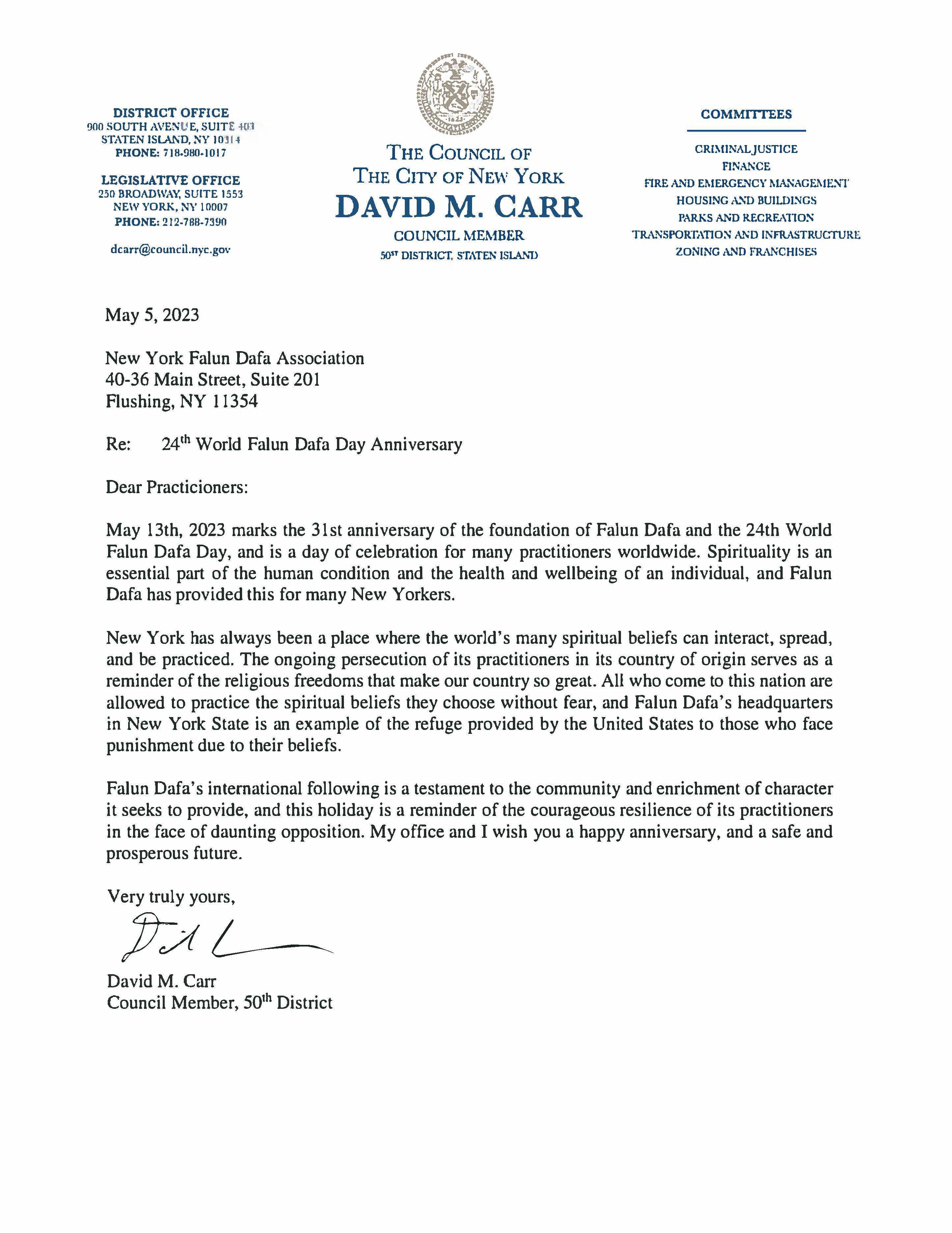 ![]() 图4:纽约市第五十选区市议员大卫·卡尔(David Carr)颁发贺信庆祝第二十四届世界法轮大法日,并明确精神信仰是人类状况和个人健康与福祉的重要组成部份,法轮大法为许多纽约人提供了这一点。 |
