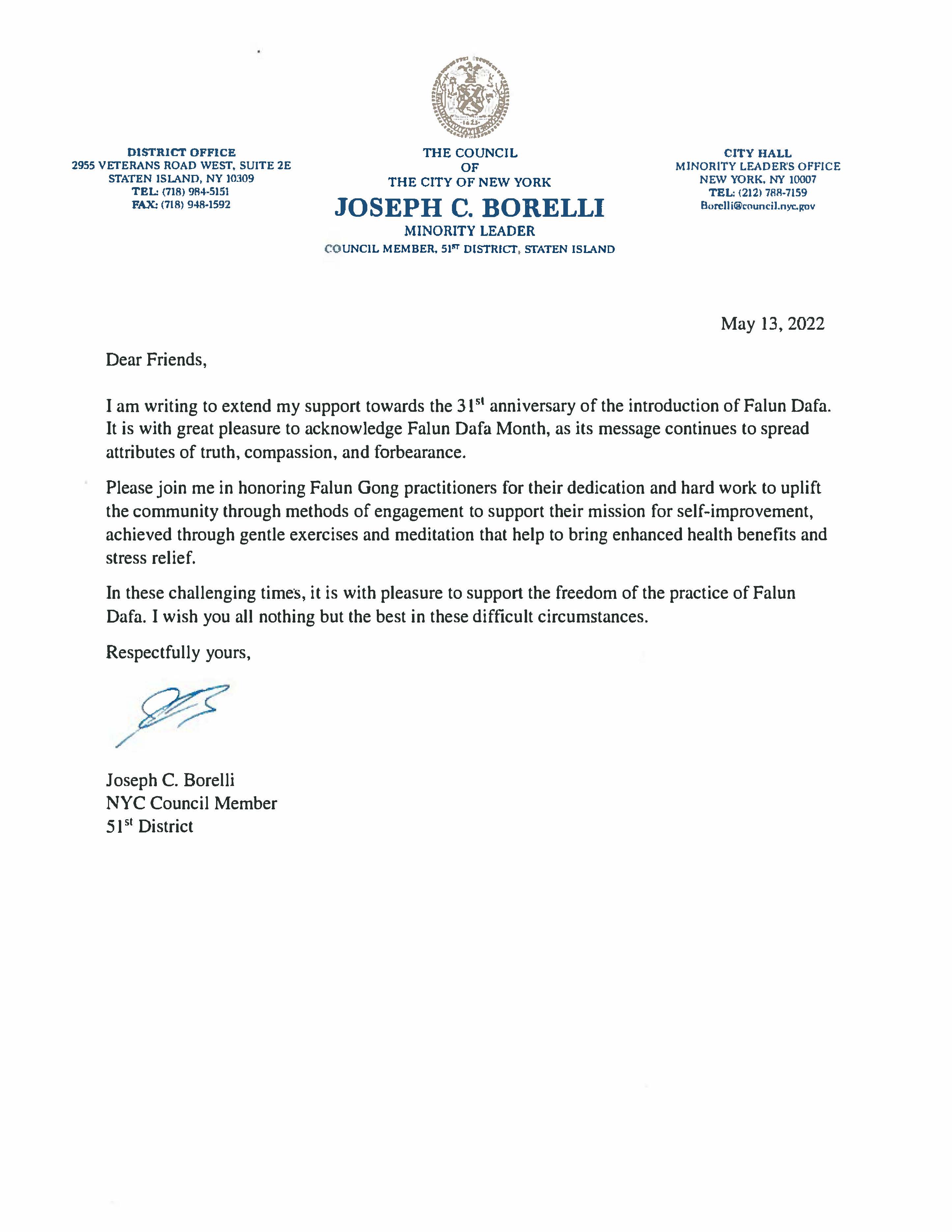 ![]() 图5:纽约市第五十一选区市议员约瑟夫·博雷利(Joseph C. Borelli)颁发贺信庆祝法轮大法月,赞扬法轮大法对真、善、忍的传播。 |