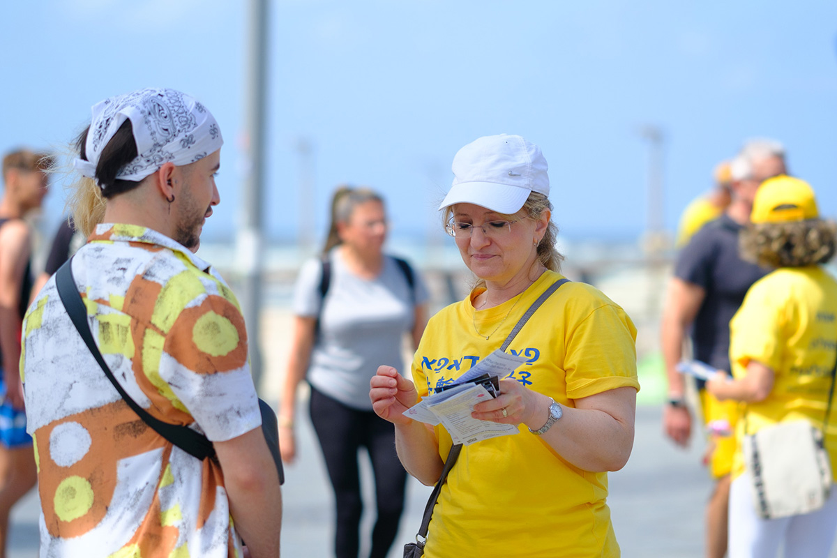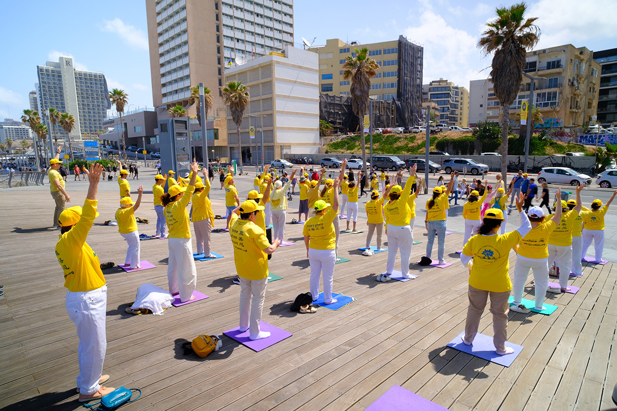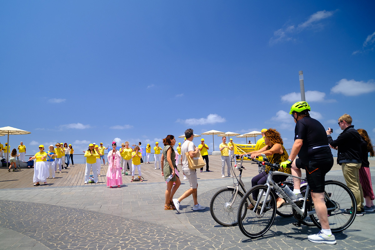 星期六是以色列的休息日。当天,春光明媚。学员们的功法演示沿着长廊向海滩延伸,人们聚集在那里散步、慢跑、锻炼、休闲或游泳。许多路人被学员们周围的美景、能量和祥和的气氛所吸引,纷纷给学员们拍照。