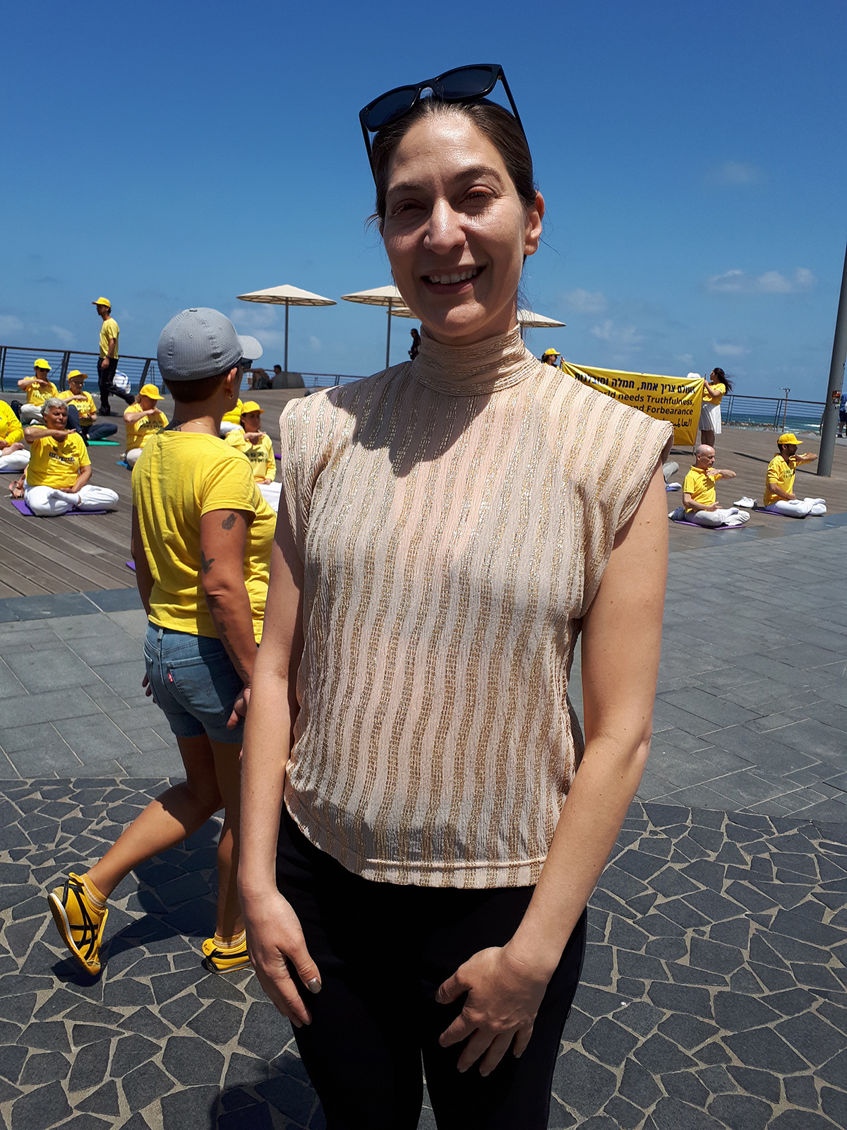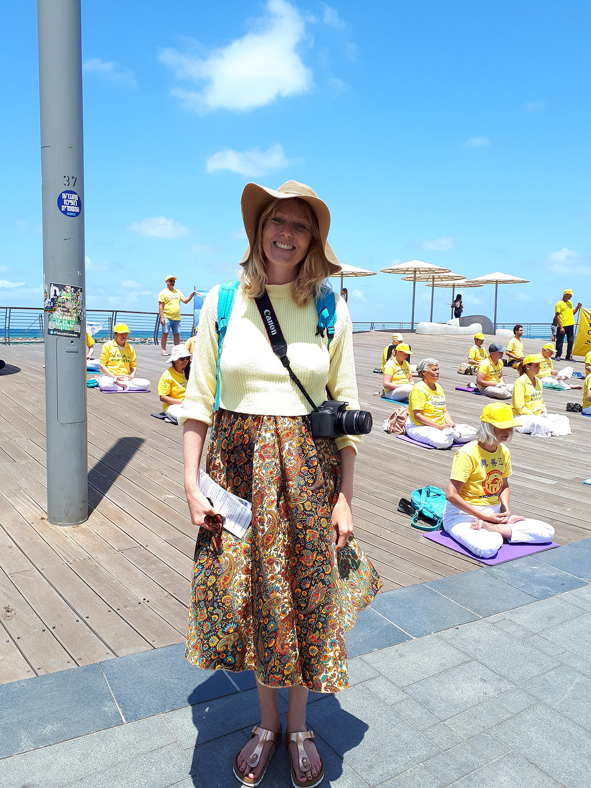 她说:“当我看着他们炼功时,我看到他们不仅想向以色列人,而且想向整个世界传达一个信息,一个世界需要真、善、忍的信息,这也正是我所相信的。”