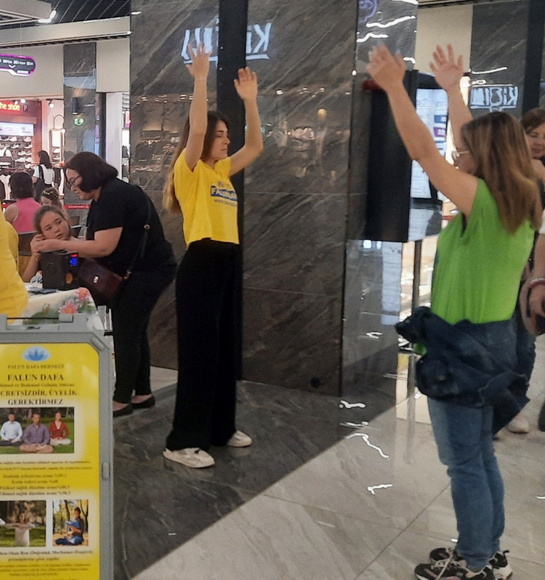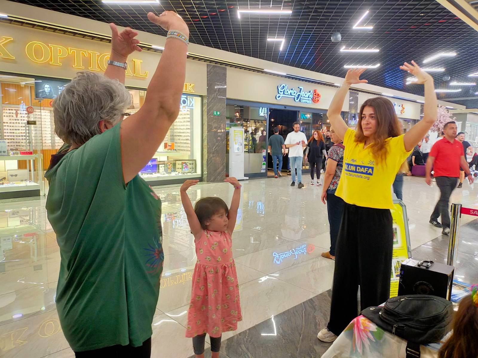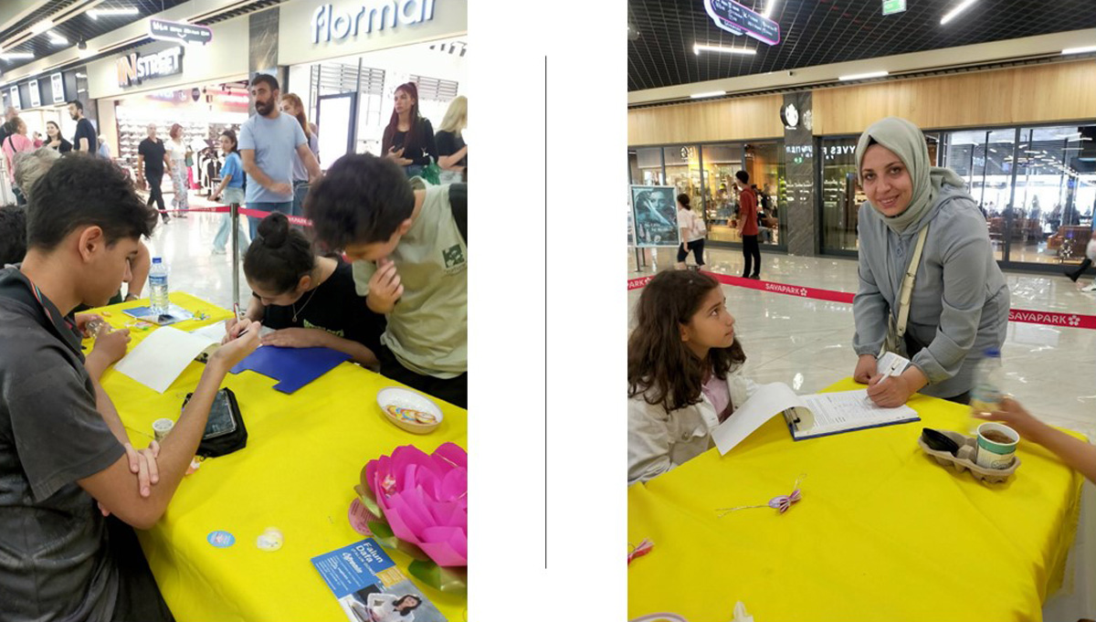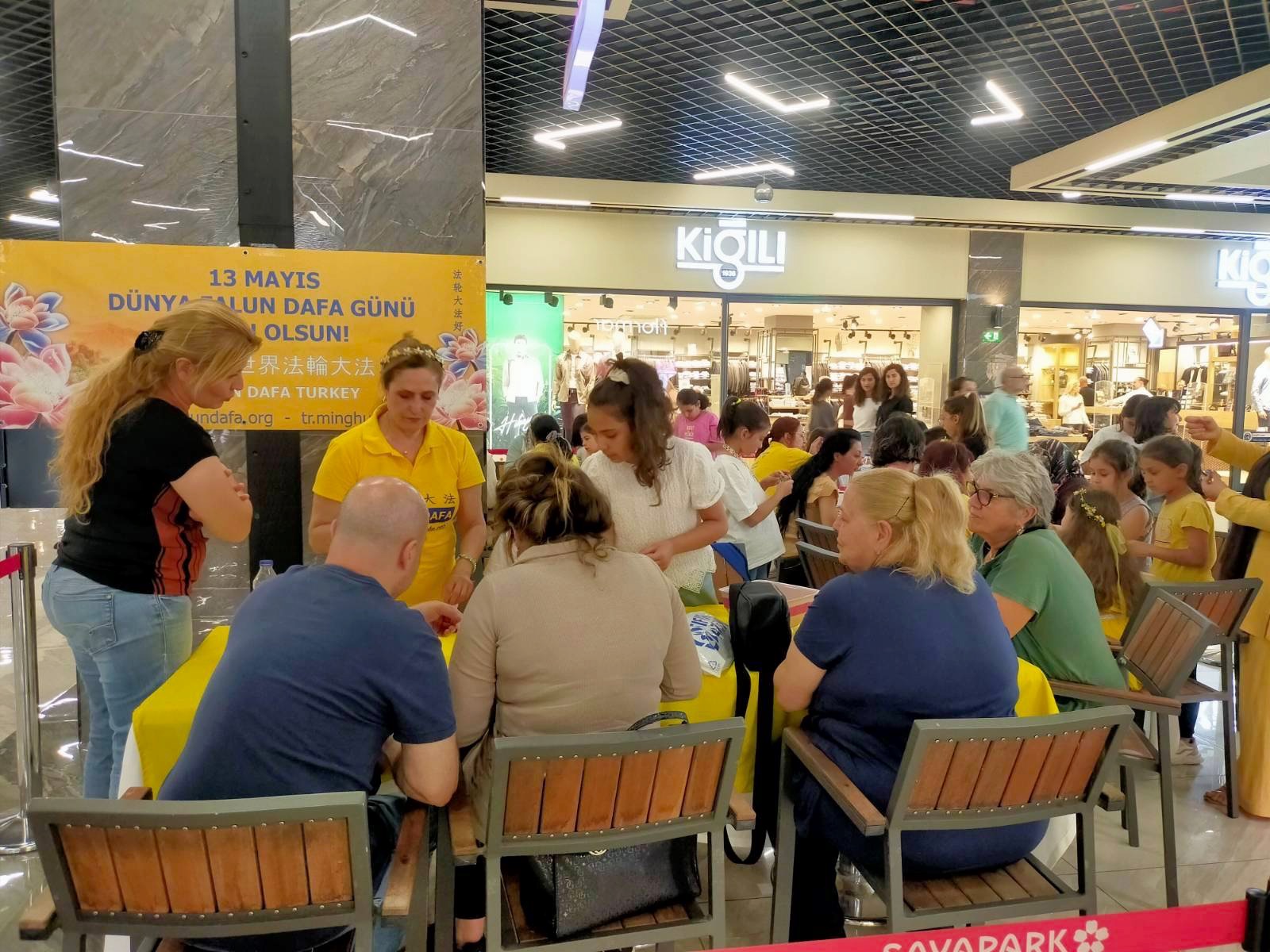 五月十三日,法轮功学员们同时在土耳其港口大城市——梅尔辛(Mersin)的萨亚帕克购物中心弘法、讲真相,告诉人们法轮大法的美好,并教他们炼功。大人和小孩们还开心地学习中国传统文化——叠纸莲花。