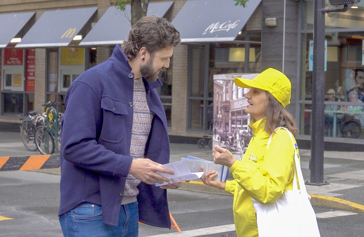 ![]() 图6:一位观众正在向法轮功学员要法轮功资料。 |