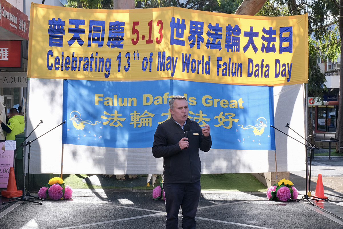 维州白马市埃尔加(Elgar)选区议员巴克(Cr Blair Barker)在集会上表达了对法轮功学员的赞美与感激。