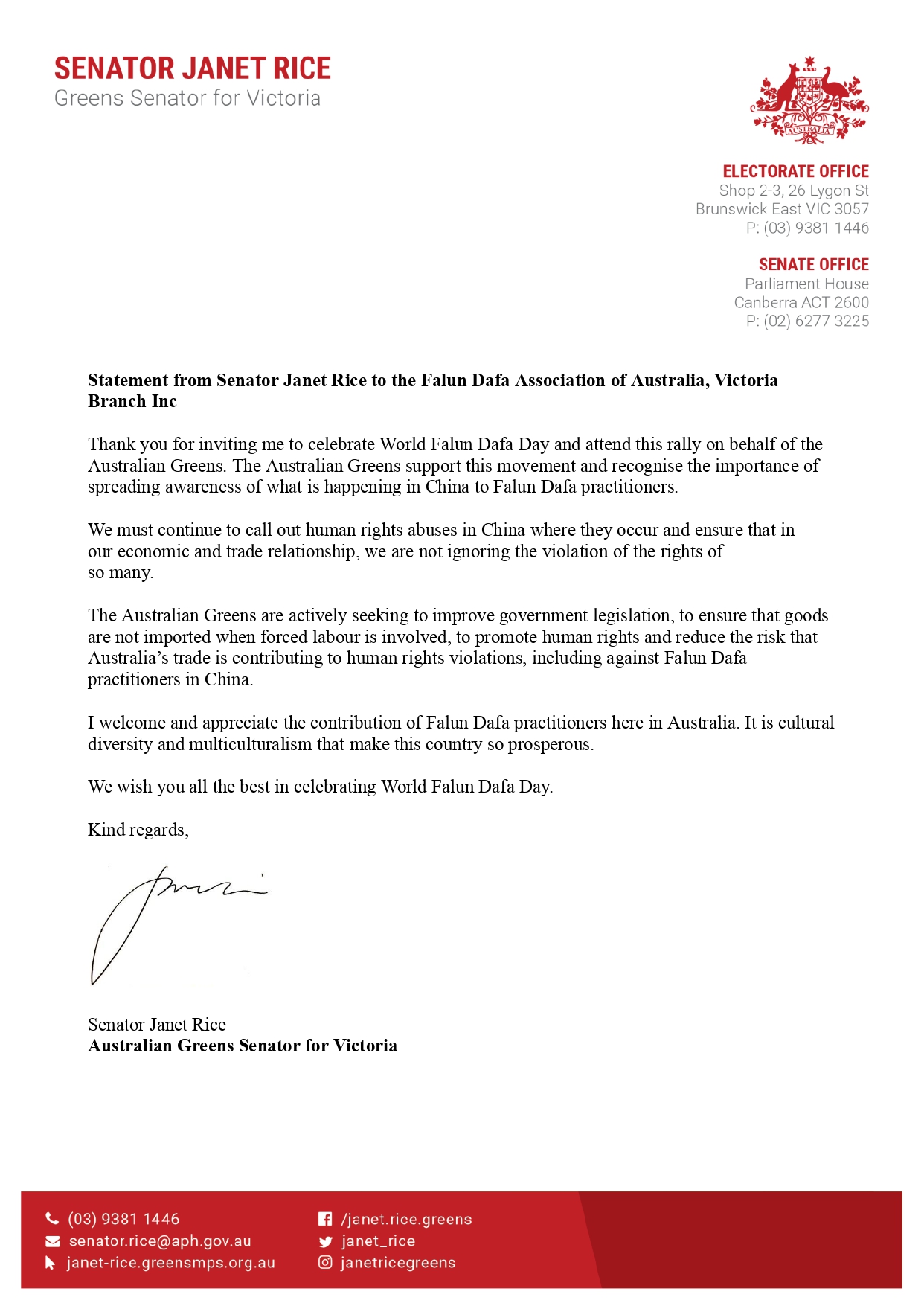 ![]() 图7:维州联邦参议员莱斯(Senator Janet Rice)女士的贺信。 |