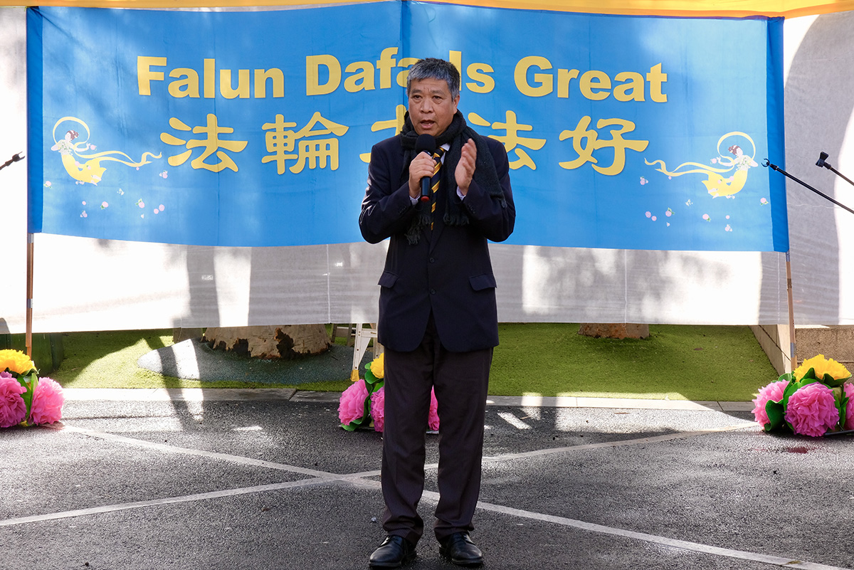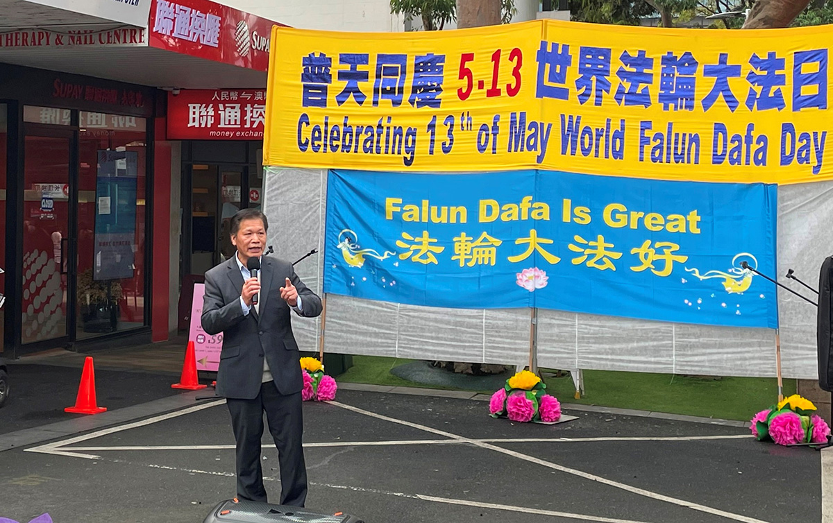 墨尔本《天安门时报》主编阮杰在致辞中说:“我不是法轮功学员,但我支持法轮功二十多年了。很多人都知道法轮功在反对共产党迫害,追求信仰自由。但各位华人朋友要了解法轮功的精神内核——真、善、忍。”