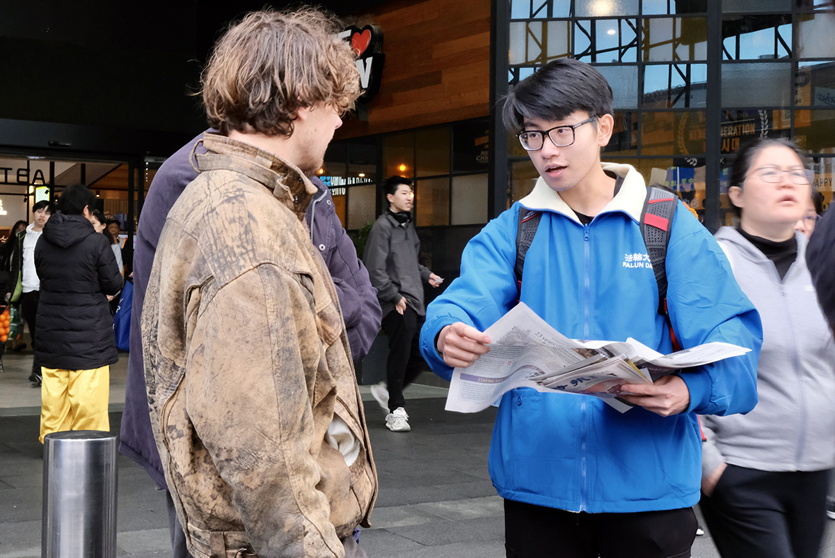 环境顾问詹姆斯(James)和友人听到天国乐团的演奏,立即好奇的停了下来,詹姆斯虽然对法轮功还不很了解,但感佩法轮功学员传播真相和真善忍普世价值的努力。