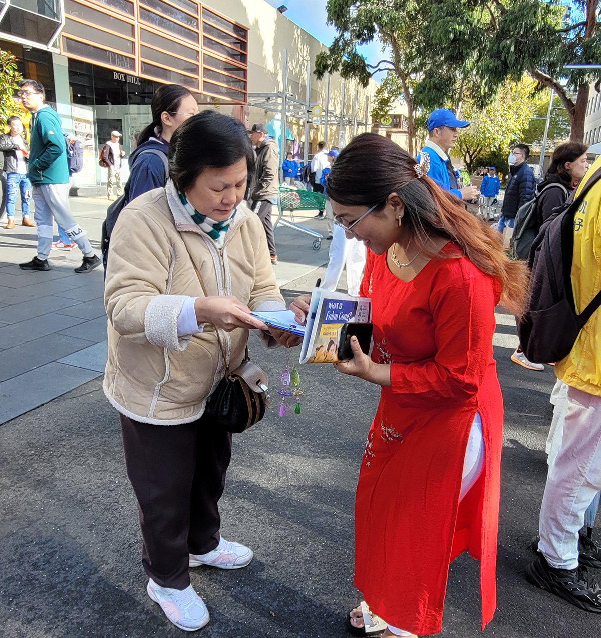 ![]() 图12~14:二零二三年五月二十日中午,墨尔本博士山(Box Hill)购物中心广场举行的5.13集会期间,民众了解真相,观赏精彩演出。 |
