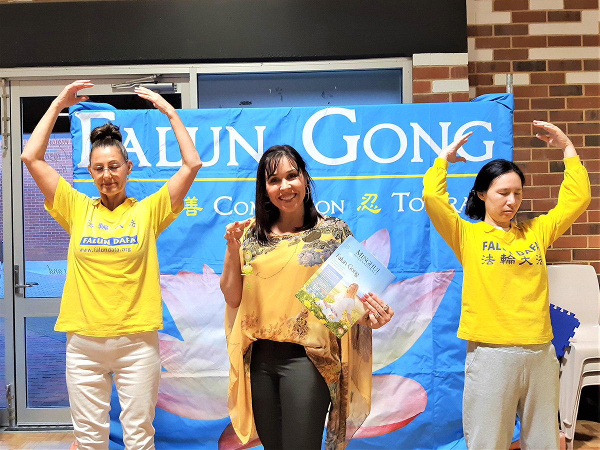 西澳法轮功学员在展位上向人们介绍法轮功,演示优美祥和的五套功法,并在舞台上为宾客带来了精彩的中华传统腰鼓表演。有的宾客表示,法轮功学员的腰鼓表演,让她们很感动。还有不少宾客对法轮功感兴趣,询问有关信息,想要学炼功法。