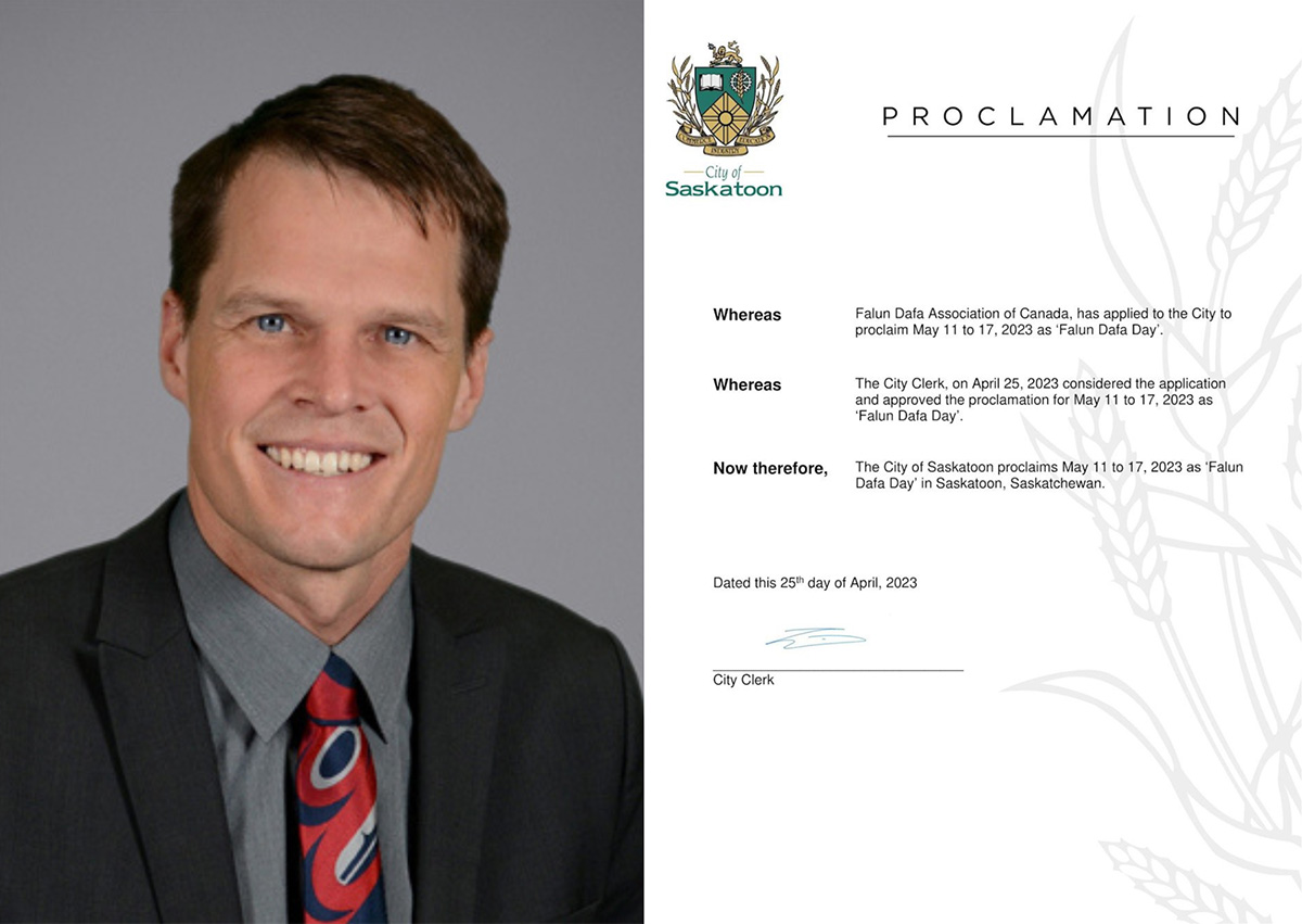 ![]() 图5:萨斯卡通市市长查理·克拉克(Charlie Clark)发褒奖,宣布,二零二三年五月十一日至十七日,为萨斯喀彻温省(Saskatchewan)萨斯卡通市“法轮大法日”。 |