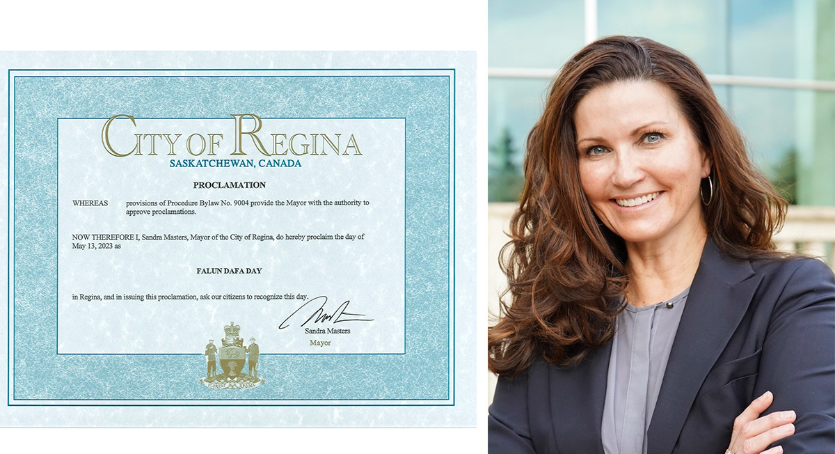 ![]() 图6:里贾纳市市长桑德拉·马斯特斯(Sandra Masters)发褒奖,宣布二零二三年五月十三日为法轮大法日。 |