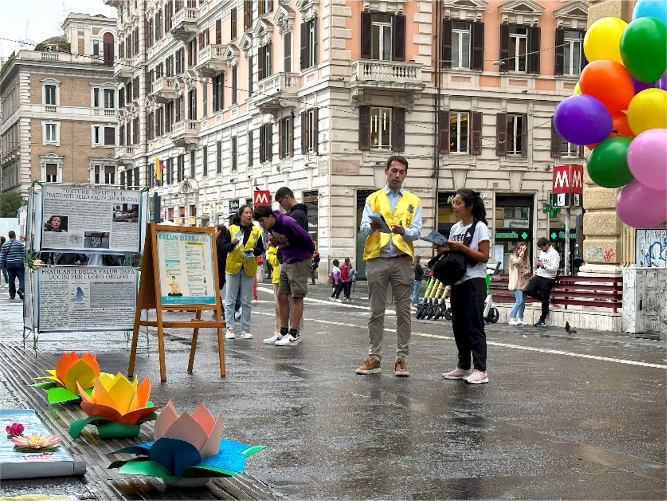 在罗马,优美的炼功音乐吸引了一个年轻的女孩,她从中感受到非同寻常的宁静,不由地停下脚步。一位学员向她说明修炼法轮功的原则是真、善、忍,功法音乐可以帮助人们在炼功过程中保持平静,并送给她真相传单。女孩收下了所有的资料,表示会来试一试(炼功)。