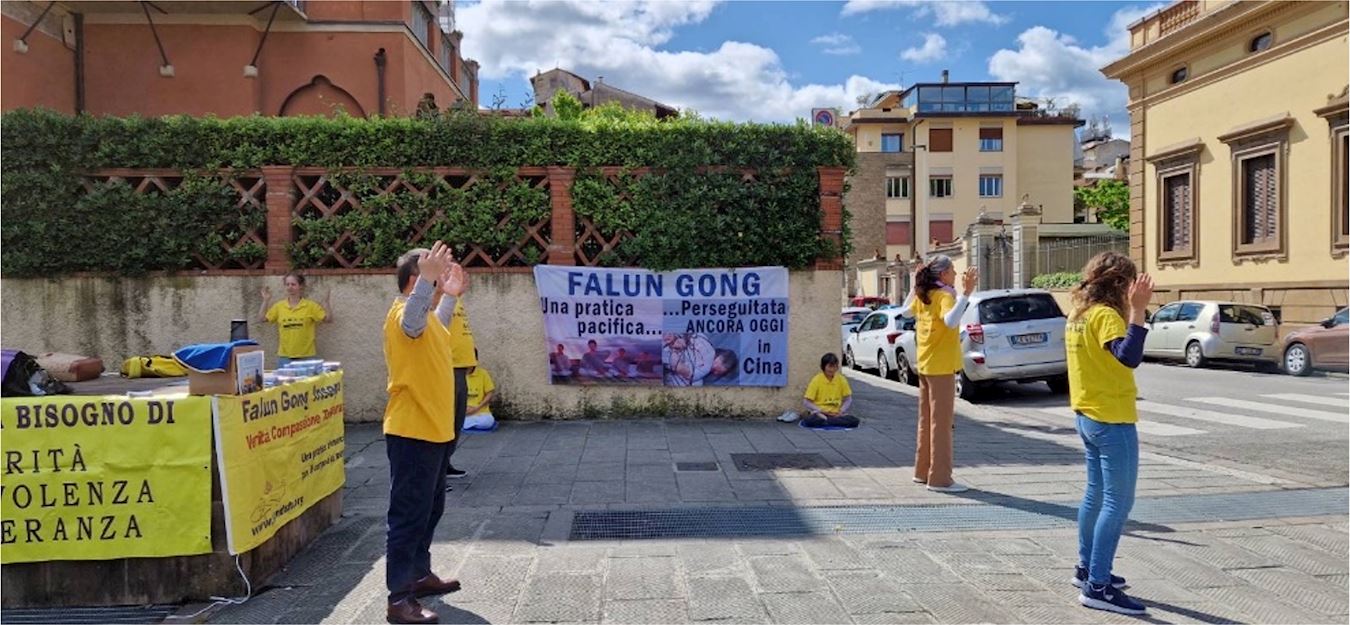 法轮功学员在佛罗伦萨的活动分为两部分:一部分是在公园集体炼功,另一部分在中领馆前举行和平集会,呼吁结束中共对法轮功的迫害。