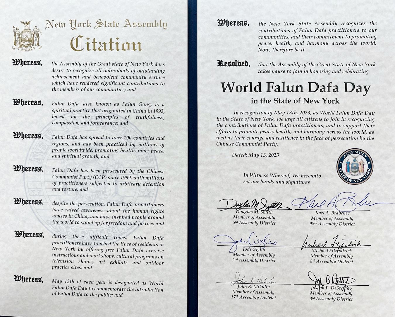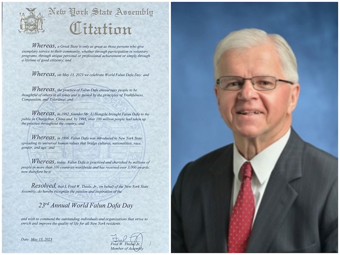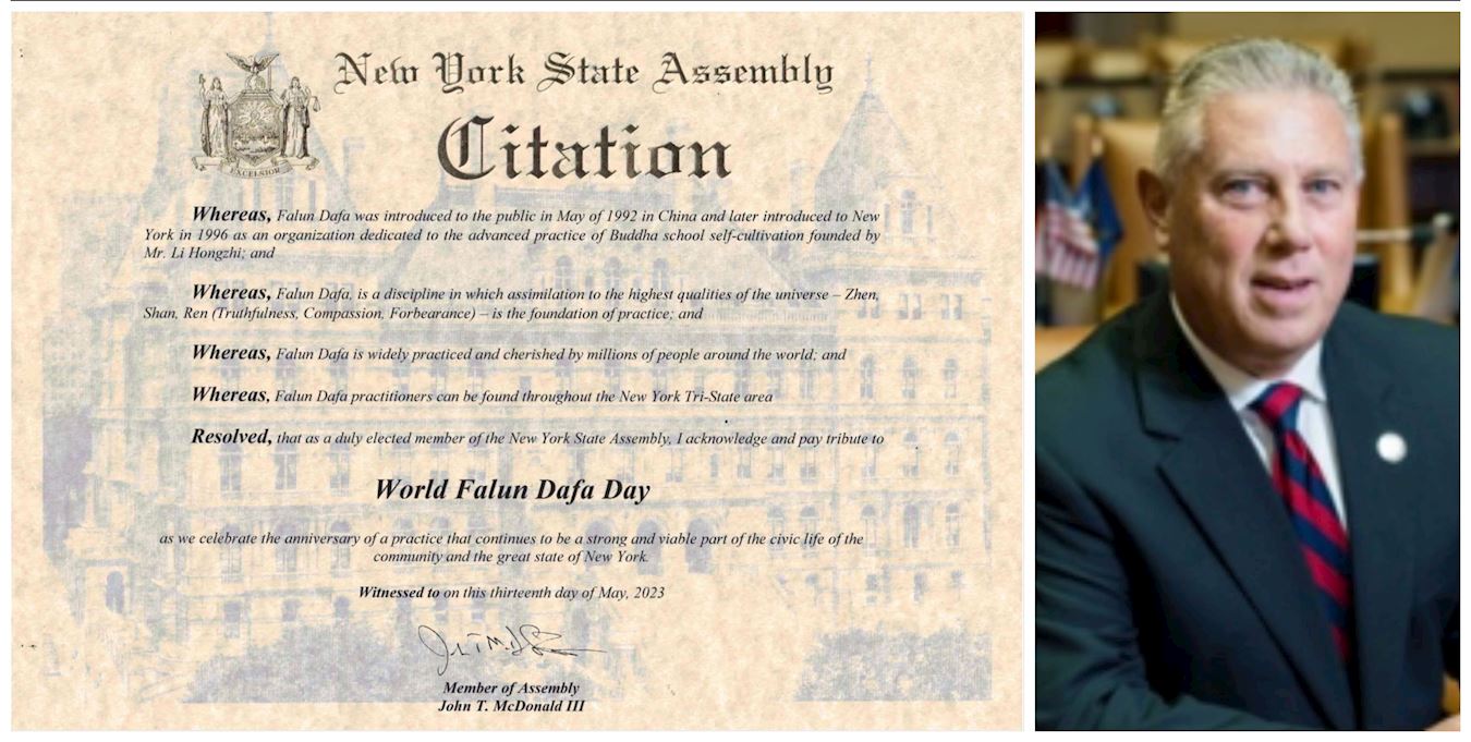 作为纽约州当选议员,我认定二零二三年五月十三日为:世界法轮大法日,并且修炼法轮大法已经成为本州岛公民社会生活中的一个强大的部份。