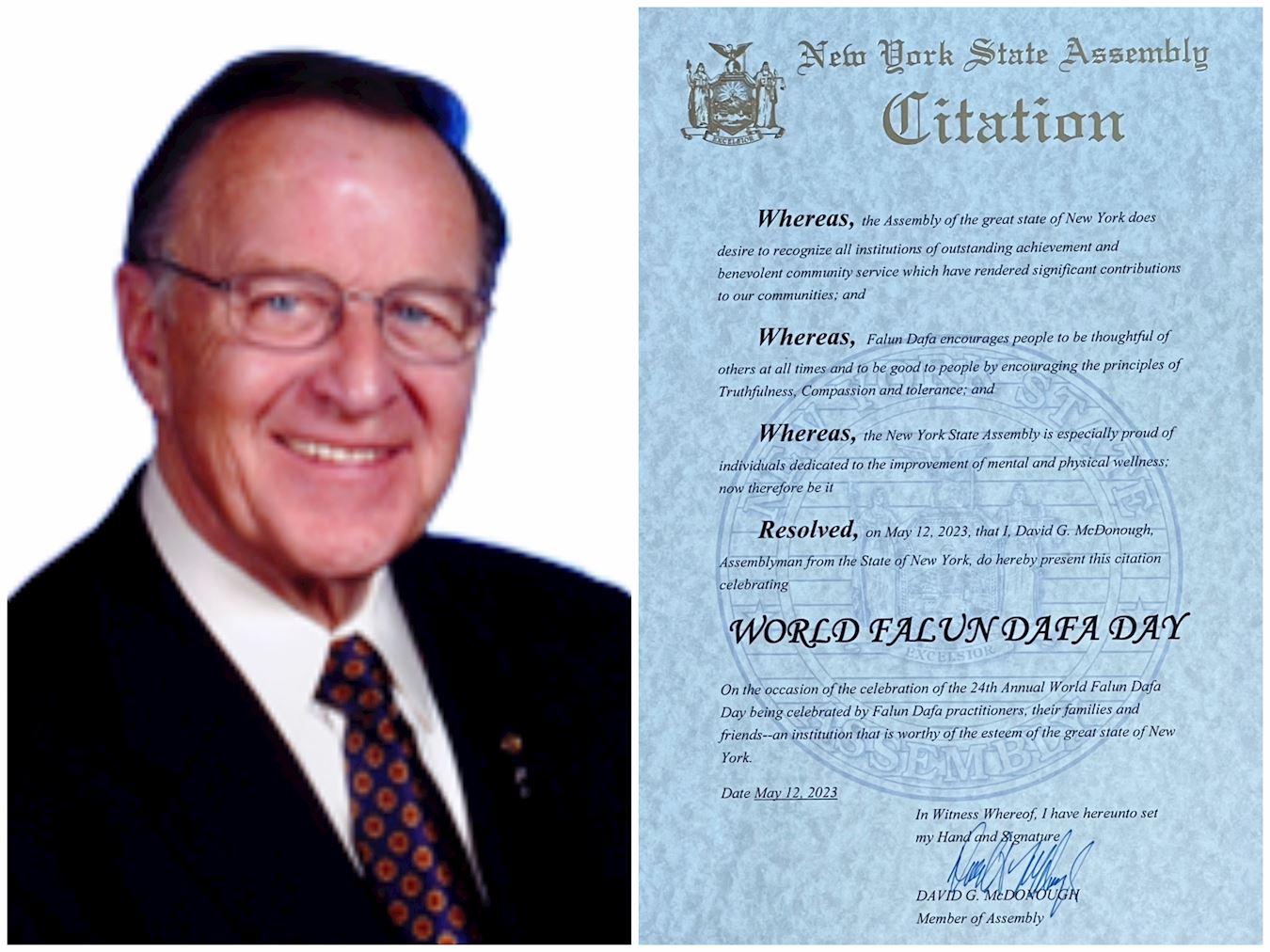 因此,二零二三年五月十三日,值此法轮大法修炼者、他们的家人、朋友和支持他们的人庆祝第二十四届世界法轮大法日之际,我,大卫·麦克唐纳,纽约州第十四议会选区议员,兹决定颁发此褒奖令。