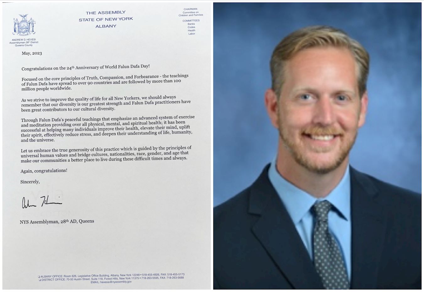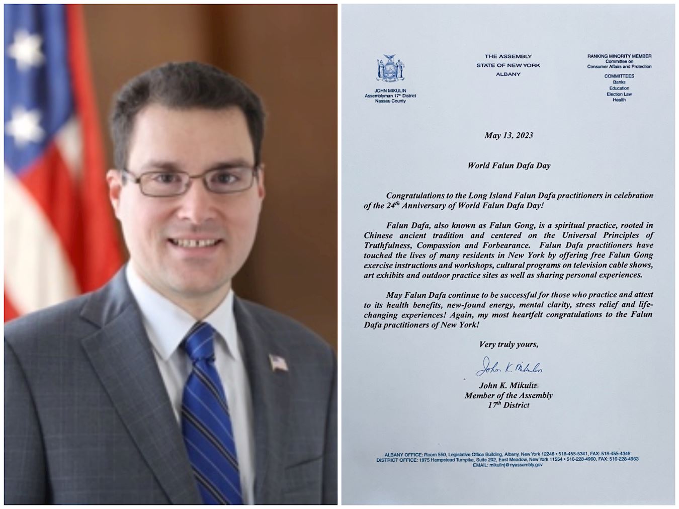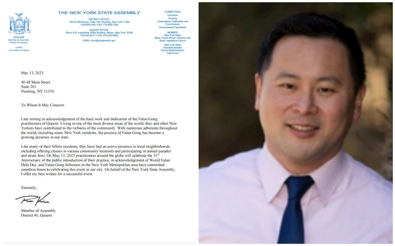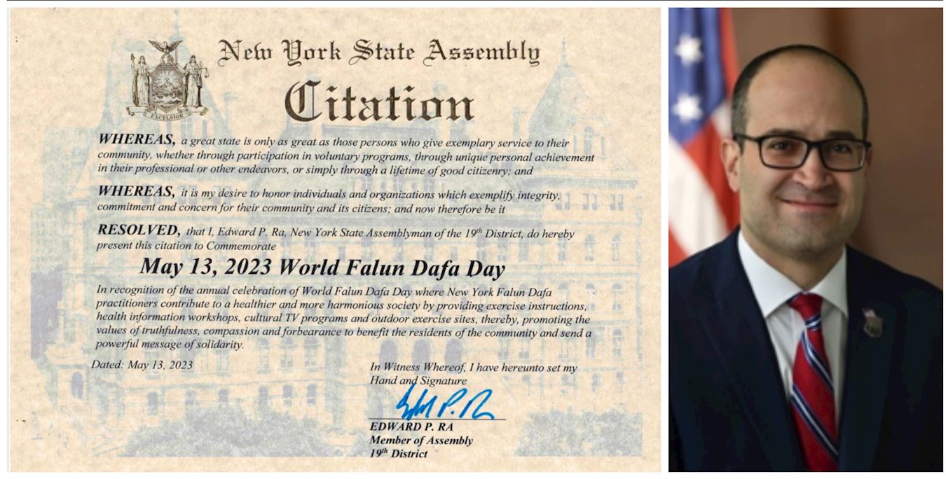 “像他们的许多同胞一样,他们积极参与当地社区活动,包括在各个社区地点提供课程,以及参加年度游行和街头集市。二零二三年五月十三日,全球各地的修炼者将庆祝公开传法三十一周年,以纪念世界法轮大法日,纽约大都会地区的法轮功修炼者投入了无数小时来庆祝这一活动。我代表纽约州议会,祝愿活动取得圆满成功。”