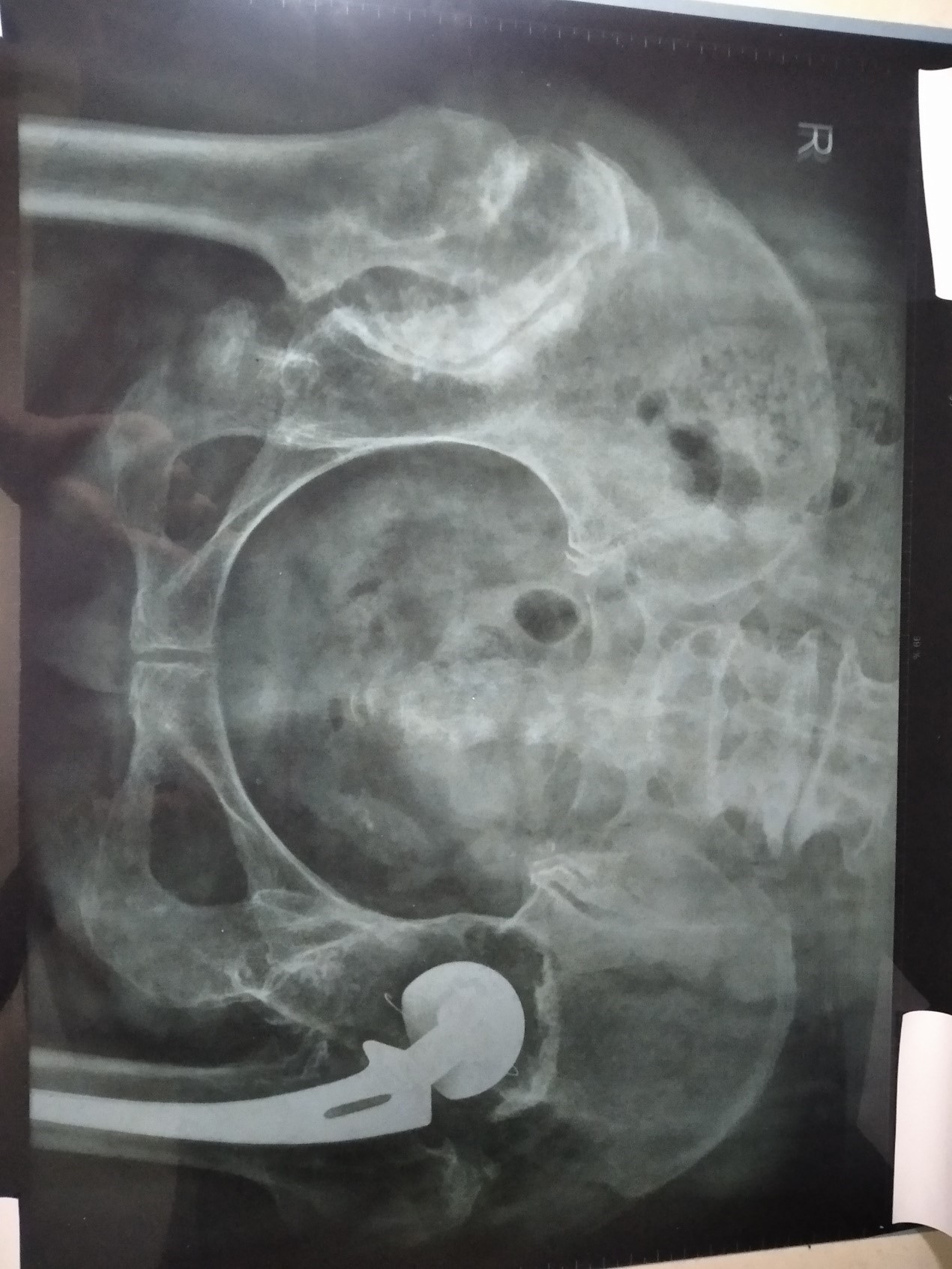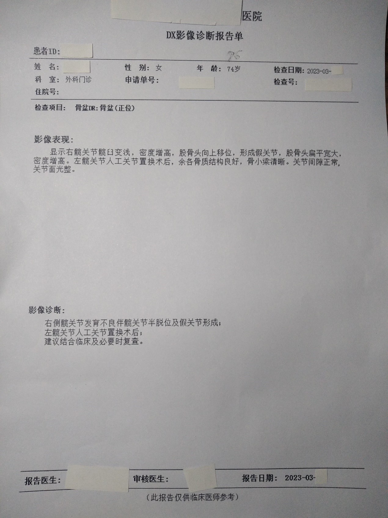 影像表现:显示右髋关节髋臼变浅,密度增高,股骨头上移位,形成假关节,股骨头扁平宽大,密度增高。左髋关节人工关节置换术后,余各骨质结构良好,骨小梁清晰,关节间隙正常,关节面光整。