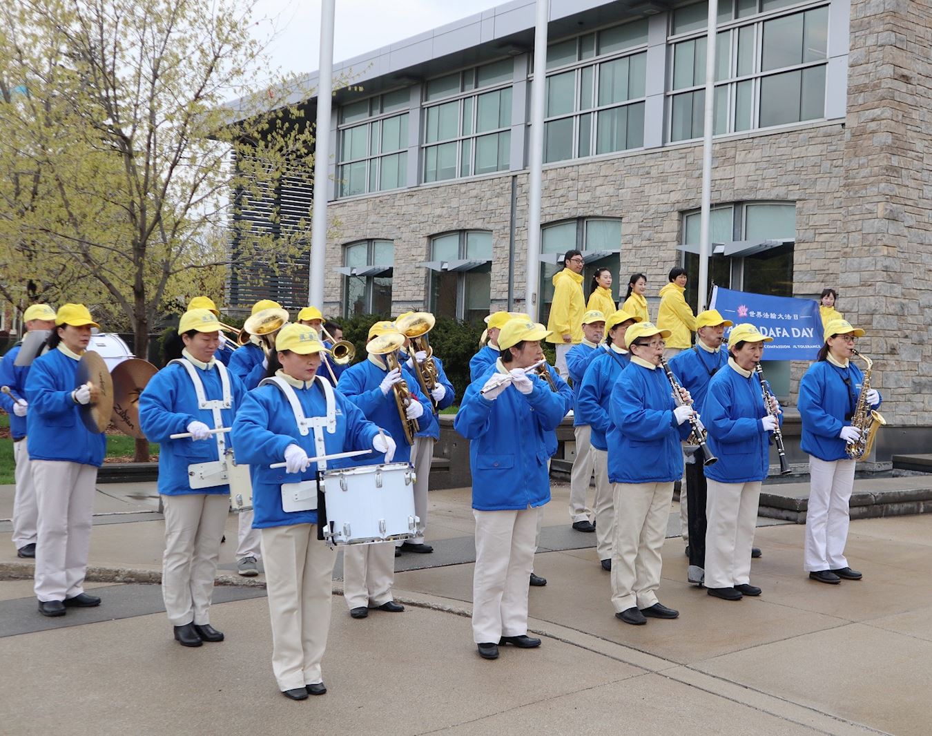 随着小乐团的合奏升旗进行曲,“世界法轮大法日(FALUN DAFA DAY)真善忍(Truthfulness Compassion Tolerance)”的旗帜在米尔顿市政厅前缓缓升起,与加拿大国旗和安河省旗三旗并立。当旗升到登峰时,克兰茨市长带头鼓起掌来。旗帜飘扬,掌声荡漾在市政厅前。
