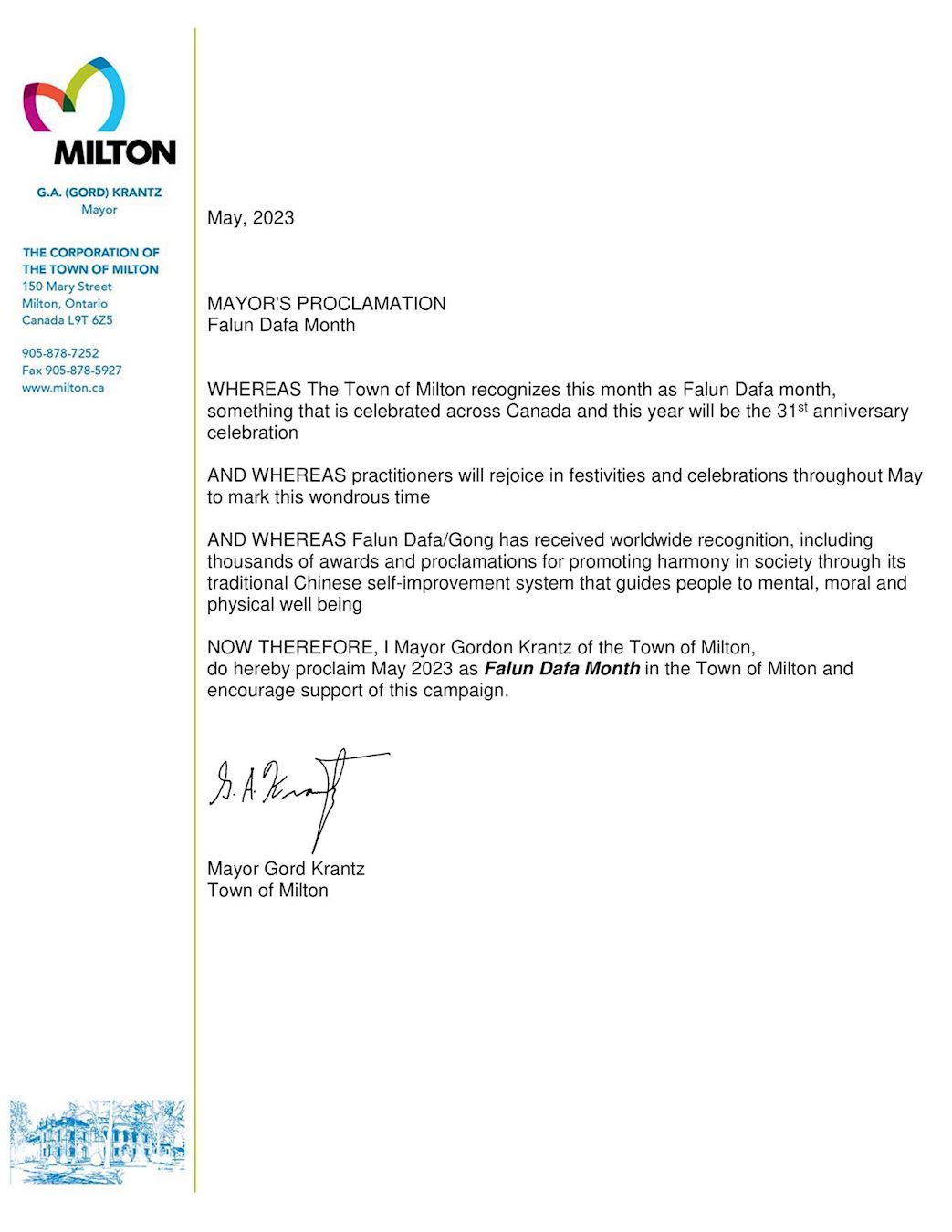 米尔顿市长戈登·克兰茨(Gordon Krantz)特此宣布二零二三年五月为“米尔顿法轮大法月”,并且鼓励大家支持这项活动。