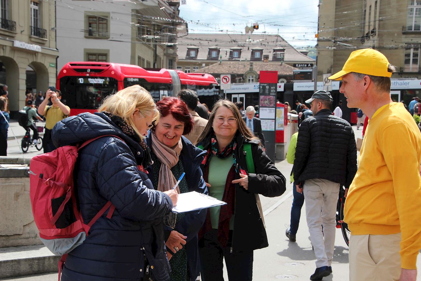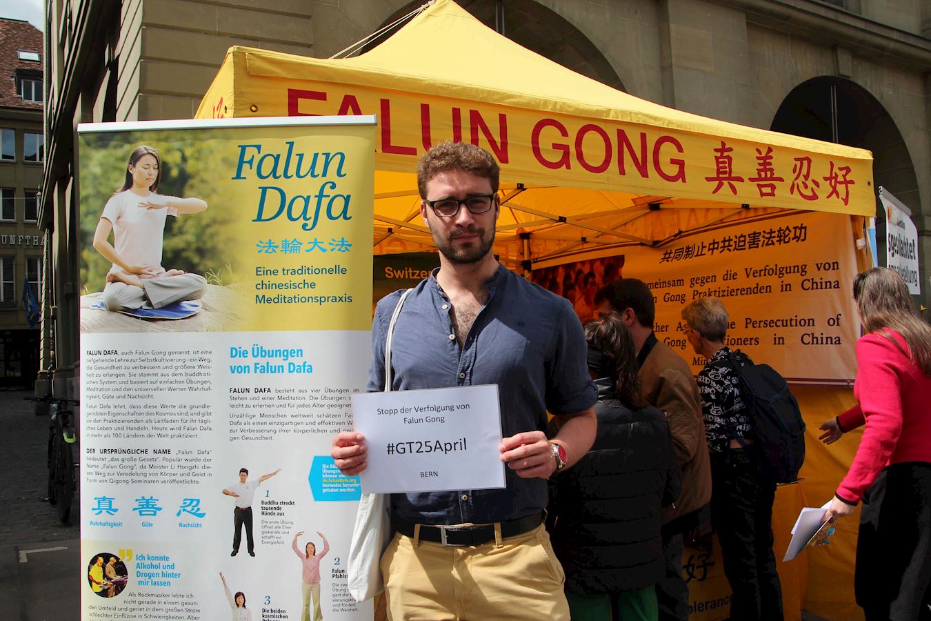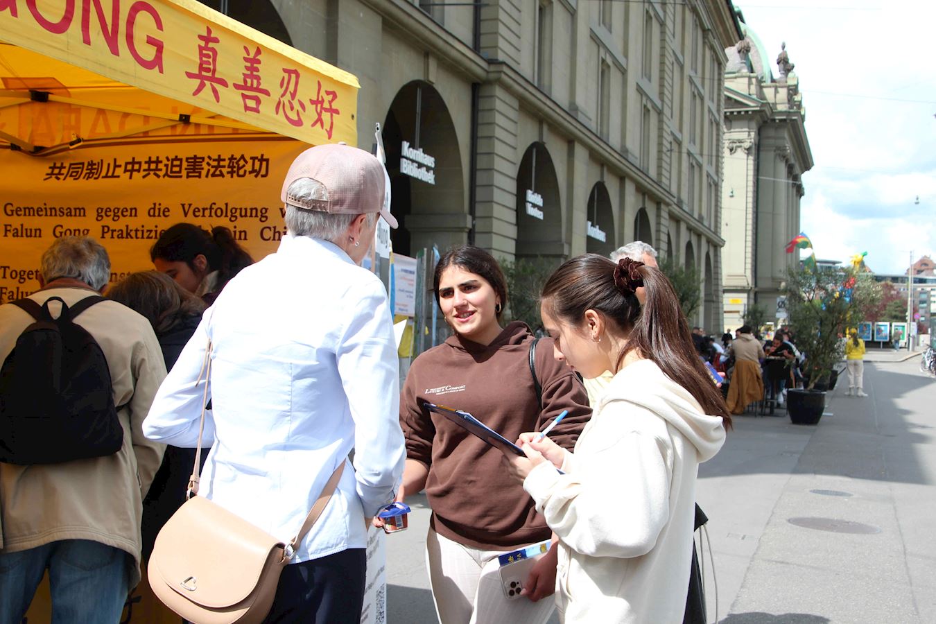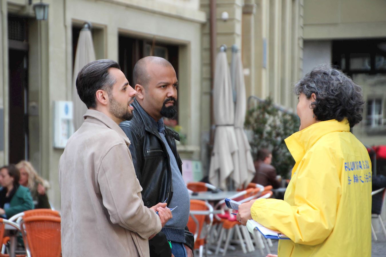 下午,学员们在伯尔尼人来人往的闹市区集会。当看到法轮功学员们静静地打坐,很多人驻足观看展出的介绍法轮功真相的展板,附近等车的路人也静静地听着学员们的发言。有的向分发真相传单的学员询问更多的讯息,有的则径直来到真相台前签名支持学员反迫害。马丁就是这其中的一员,他还打算回家后查阅网站,了解更多的关于法轮大法的讯息。