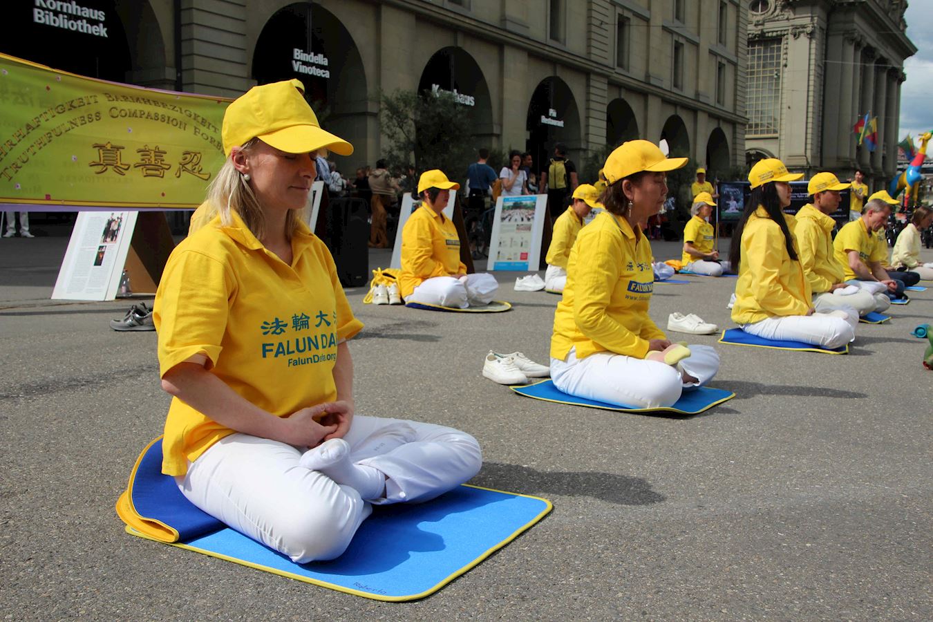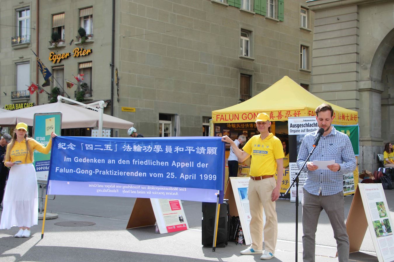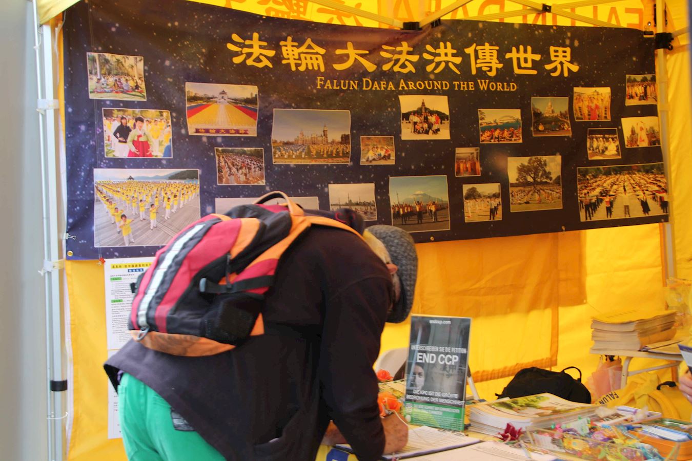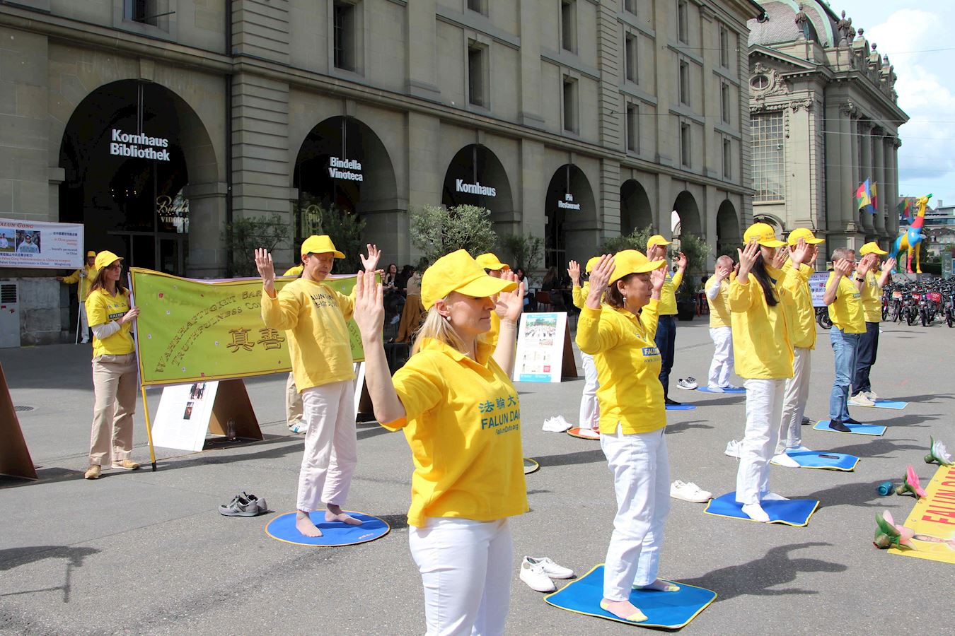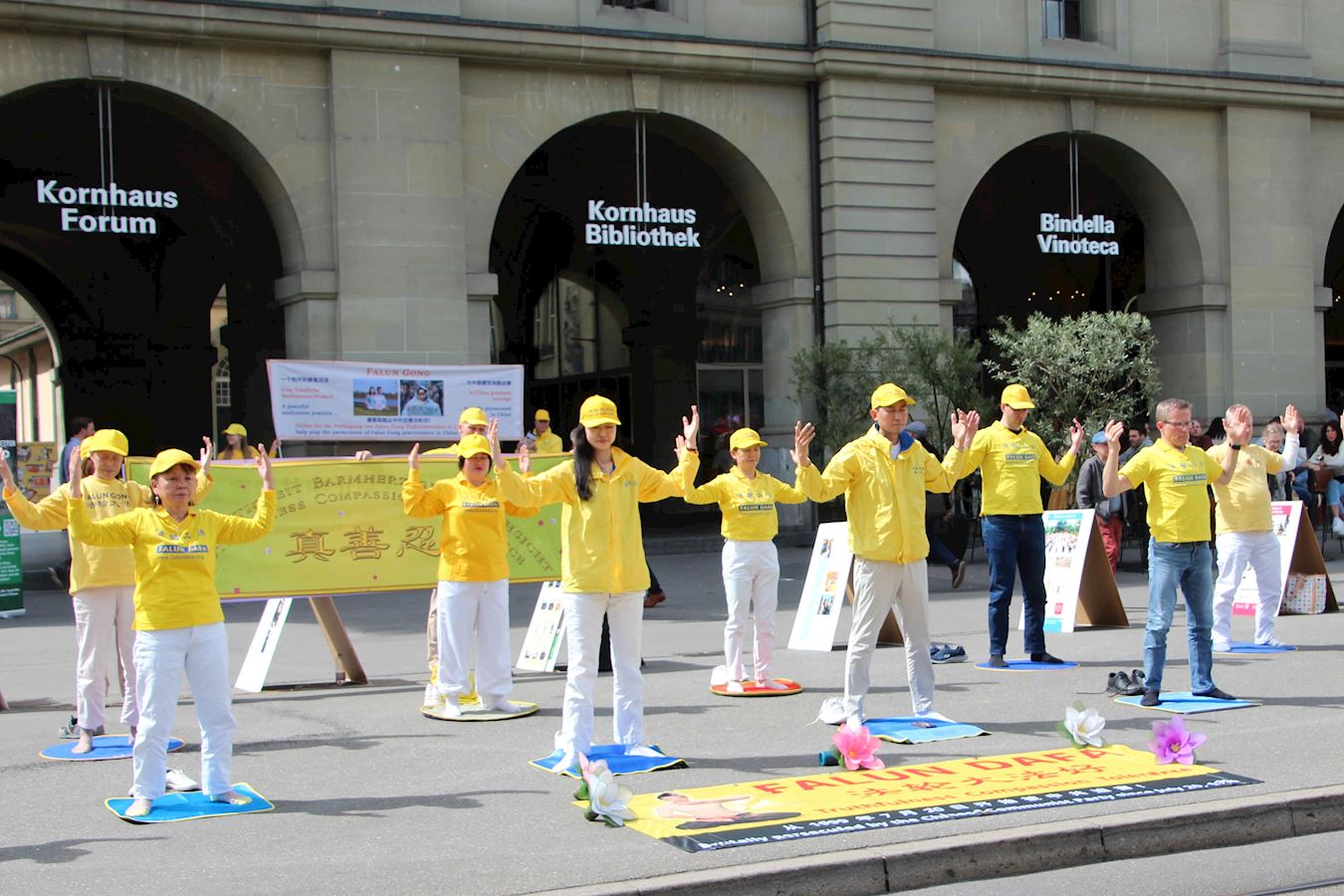 下午,学员们在伯尔尼人来人往的闹市区集会。当看到法轮功学员们静静地打坐,很多人驻足观看展出的介绍法轮功真相的展板,附近等车的路人也静静地听着学员们的发言。有的向分发真相传单的学员询问更多的讯息,有的则径直来到真相台前签名支持学员反迫害。马丁就是这其中的一员,他还打算回家后查阅网站,了解更多的关于法轮大法的讯息。