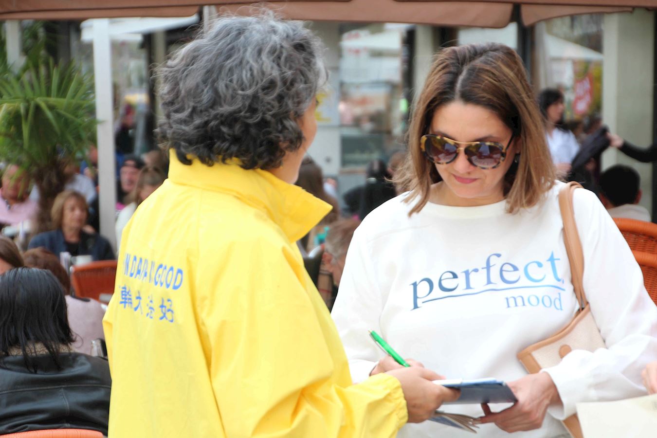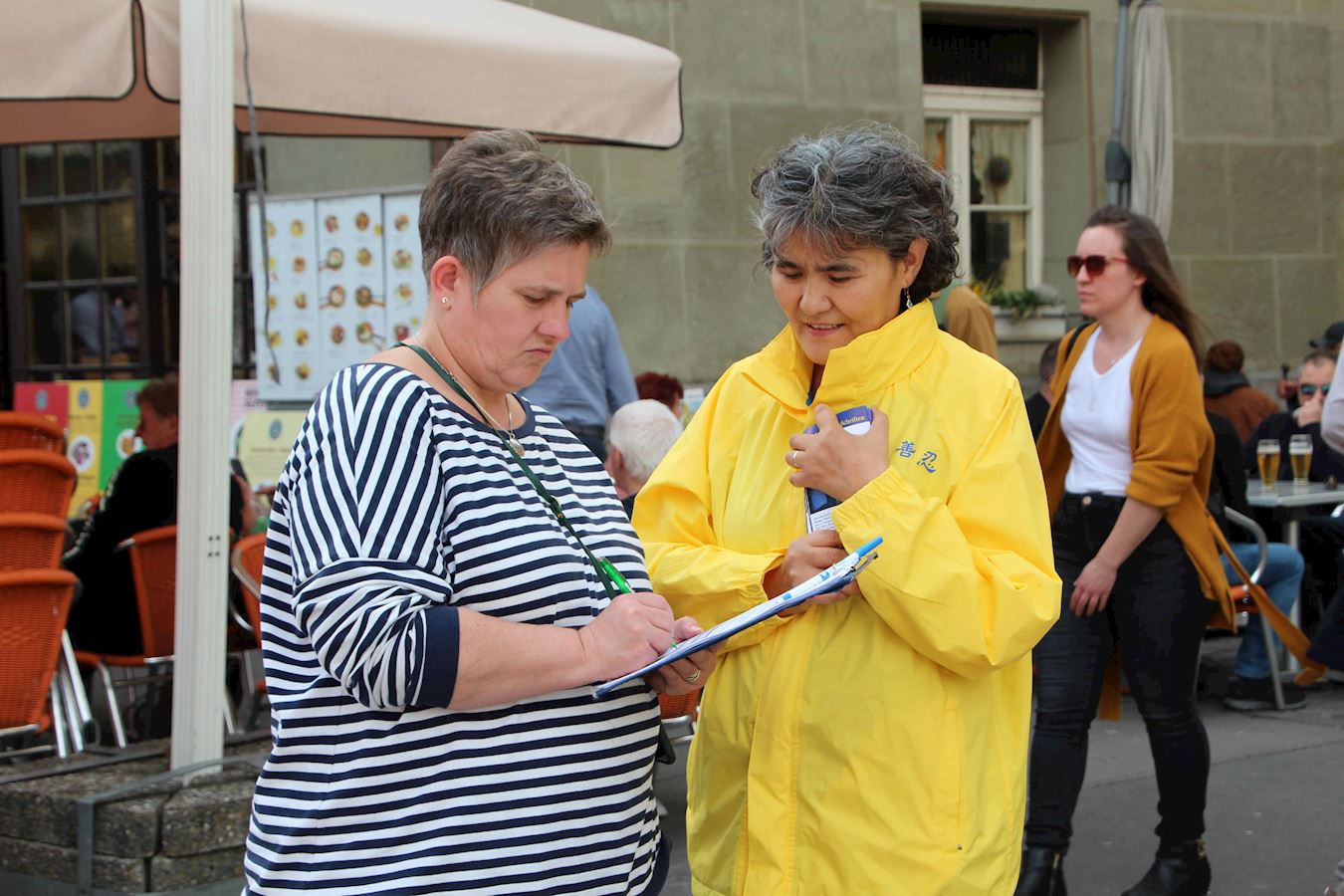 心理医生苏珊·韦伯(Susan Weber)曾在苏黎世看过关于法轮大法的真相影片,所以路过时,她当即签名,并觉得:“能为此(停止迫害)助一臂之力真的非常好。”
