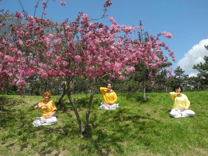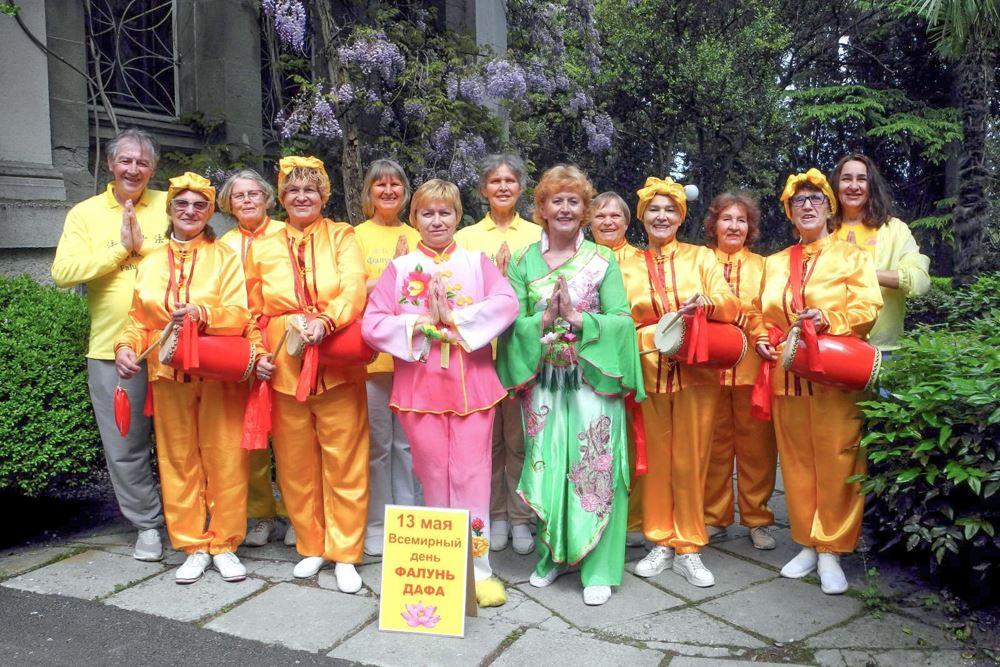 五月十三日,来自克里米亚的部分法轮功学员在雅尔塔一家医院的花园中举行庆祝活动。伴随着优美的炼功音乐,学员们身着金色丝绸炼功服向民众展示五套功法,现场还布置有五彩莲花,呈现一片祥和的气氛。