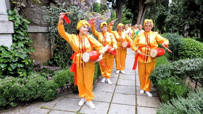 活动中,法轮功学员一边表演腰鼓《法轮大法好》,一边绕花园游行,吸引了众多路人的关注。