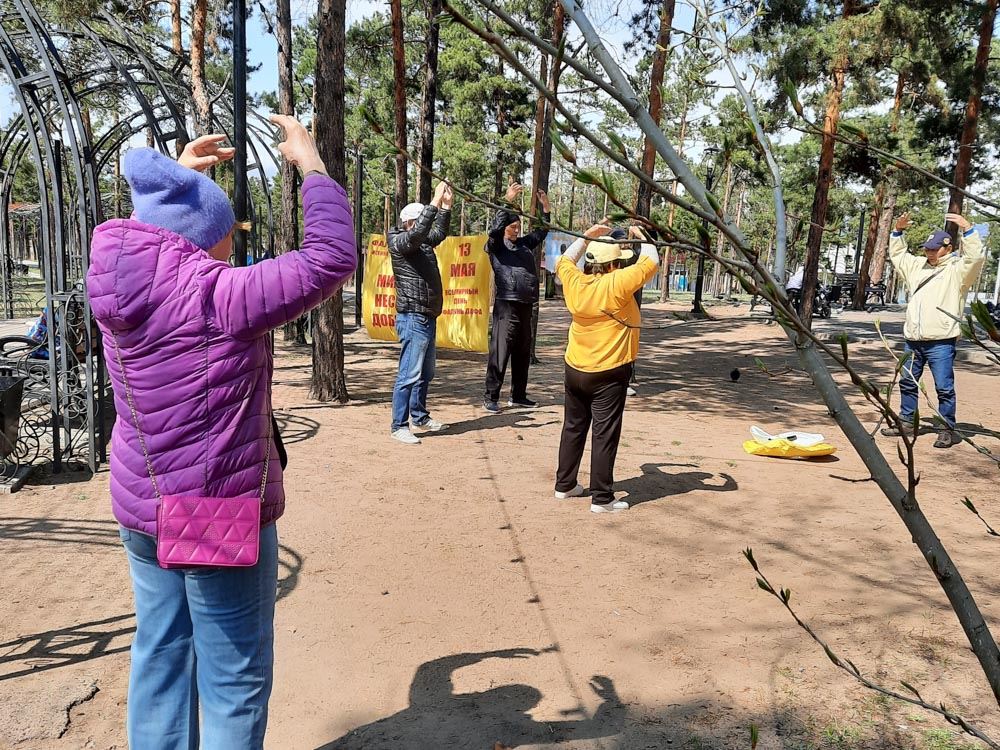 五月二十日,来自乌兰乌德(Ulan-Ude)的部份法轮功学员在该市的一个公园内举办了庆祝活动。他们悬挂起法轮功信息横幅,向来往的民众介绍法轮功,并进行功法演示。