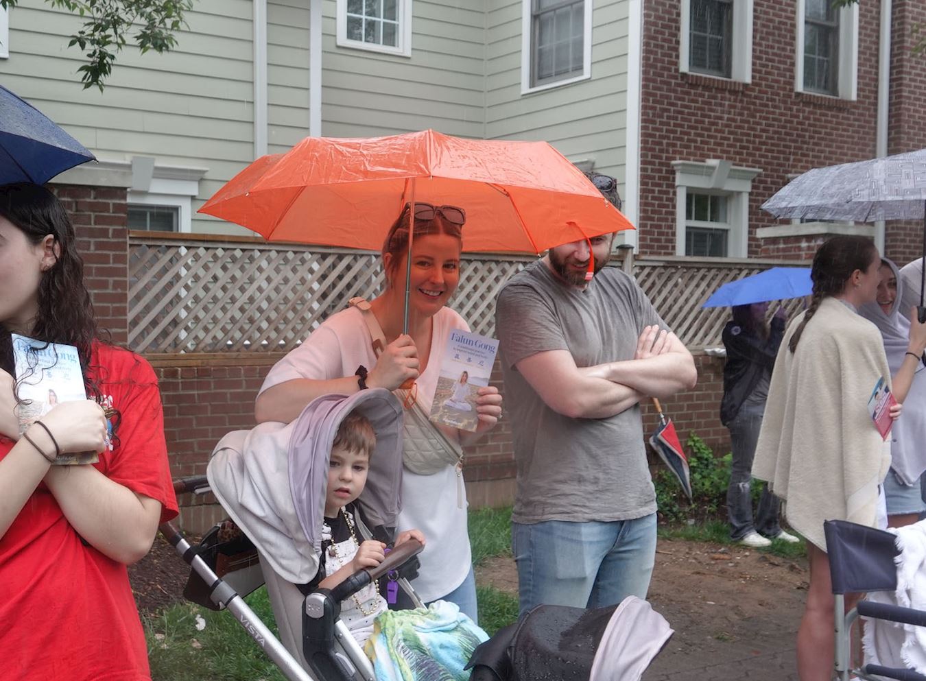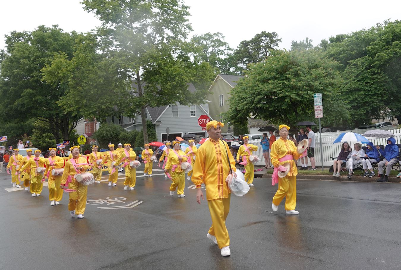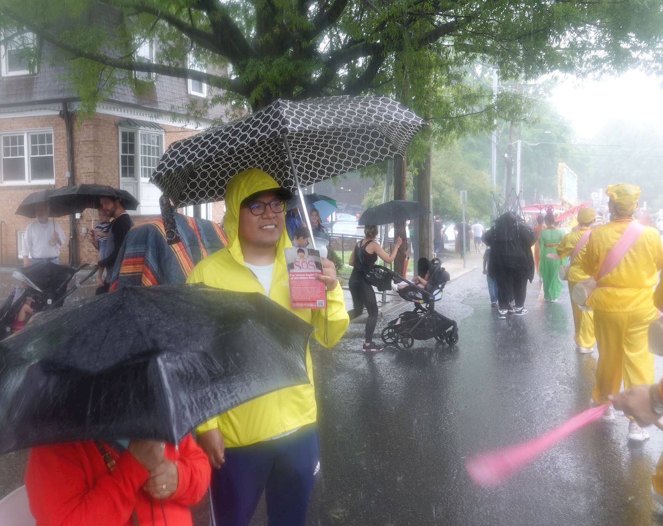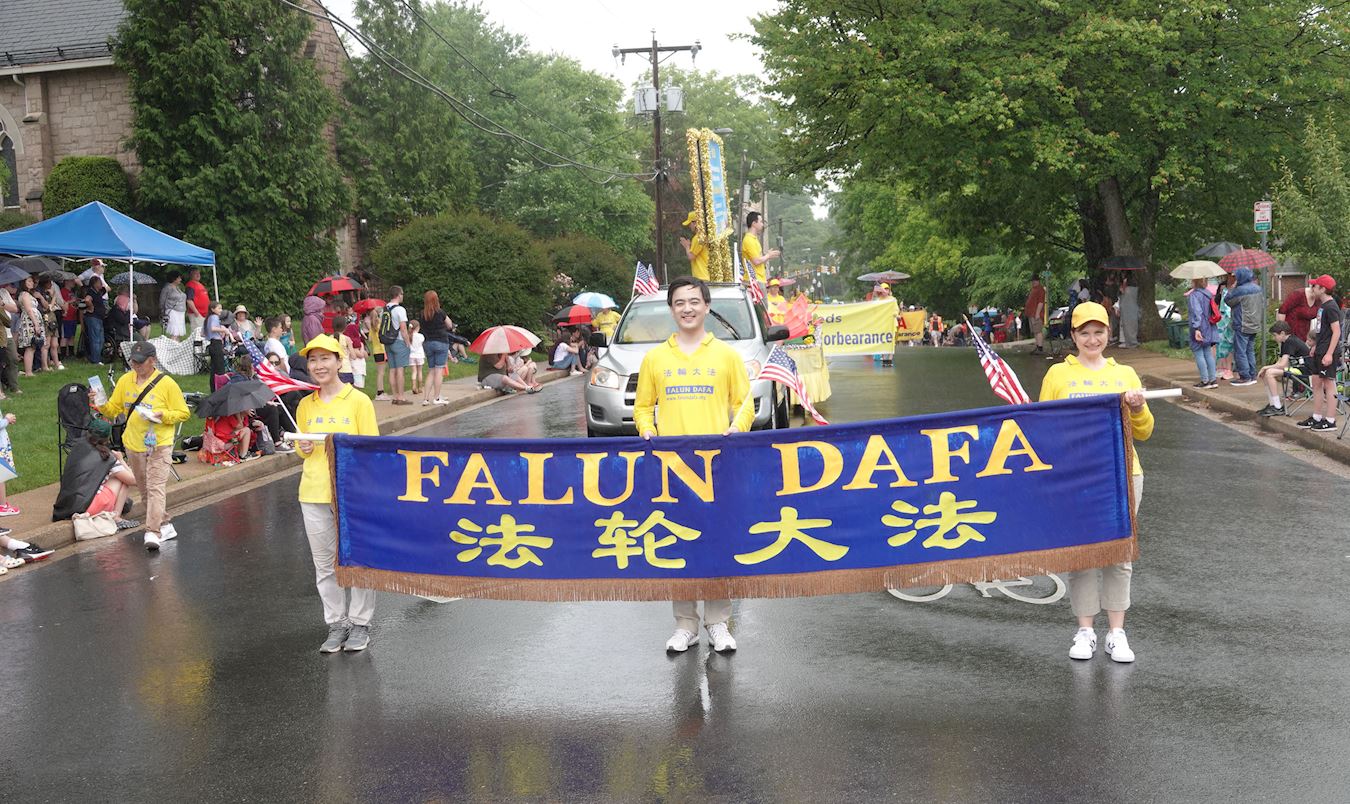 ![]() 图2:五月二十九日下午,大华府地区部分法轮功学员参加了华盛顿近郊弗吉尼亚州瀑布教堂市(Falls Church)的游行,他们冒雨走完游行全程。 |