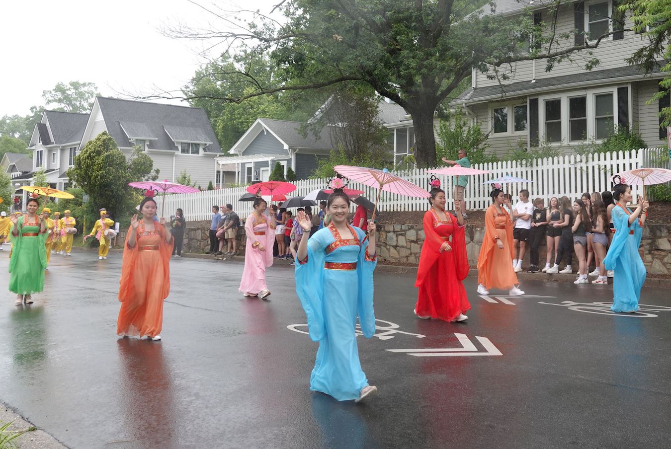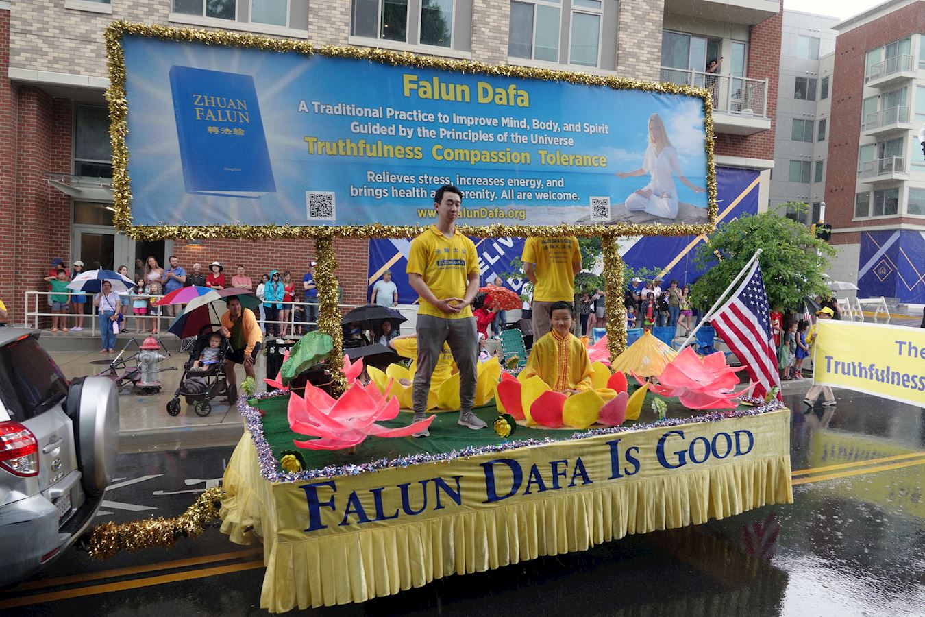 冒着瓢泼大雨,当地居民打着雨伞在路边观看法轮功的游行队伍,脸上洋溢着笑容,沉浸在祥和欢乐的氛围中。他们伴着法轮大法好的音乐,有节奏的为法轮功学员鼓掌喝彩。很多第一次听说法轮功的各族裔民众兴奋地接过法轮功学员递给他们的真相传单,他们说,回家后要更详细地了解法轮大法。