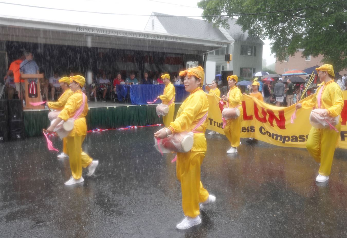下午两点,游行开始时。天下起了瓢泼大雨,法轮功学员走完全程,受到沿途民众的欢迎。在暴雨中观看游行的民众说,虽然全身都淋湿了,但是他们为法轮功学员感到骄傲,感谢他们把法轮大法的信息传递给当地的民众。当游行队伍途径主席台时,主持人请民众再次为法轮功学员鼓掌喝彩。